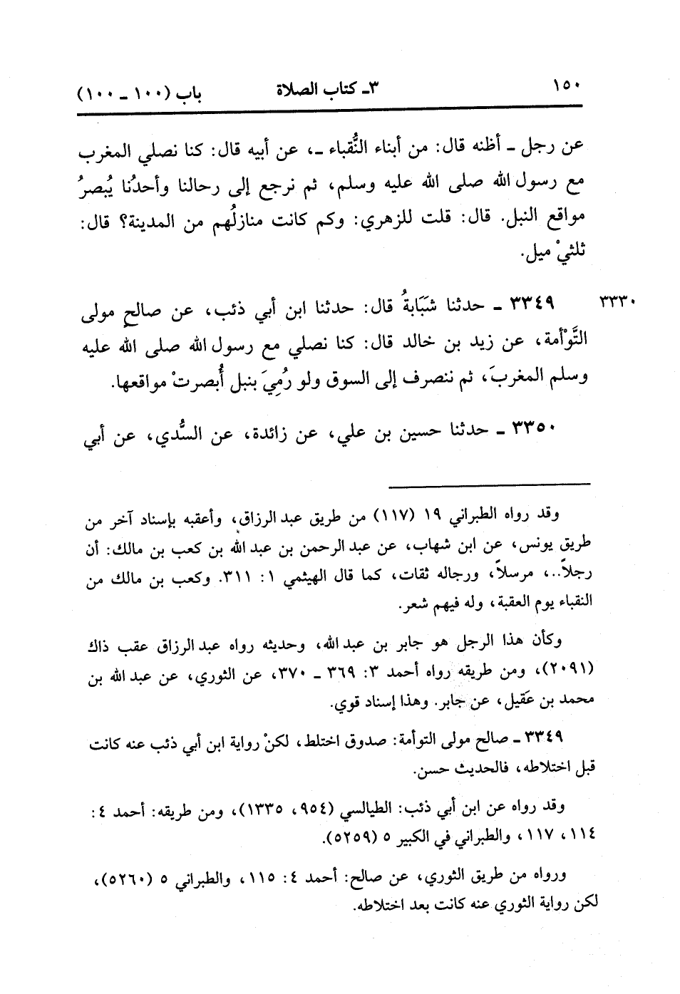 3349- حَدَّثَنَا شَبَابَةُ ، قَالَ : حَدَّثَنَا ابْنُ أَبِي ذِئْبٍ ، عَنْ صَالِحٍ مَوْلَى التَّوْأَمَةِ ، عَنْ زَيْدِ بْنِ خَالِدٍ ، قَالَ : كُنَّا نُصَلِّي مَعَ رَسُولِ اللهِ صَلَّى الله عَلَيْهِ وَسَلَّمَ الْمَغْرِبَ ، ثُمَّ نَنْصَرِفُ إلَى السُّوقِ ، وَلَوْ رُمِيَ بِنَبْلٍ أُبْصِرَتْ مَوَاقِعَهَا. (1/329).