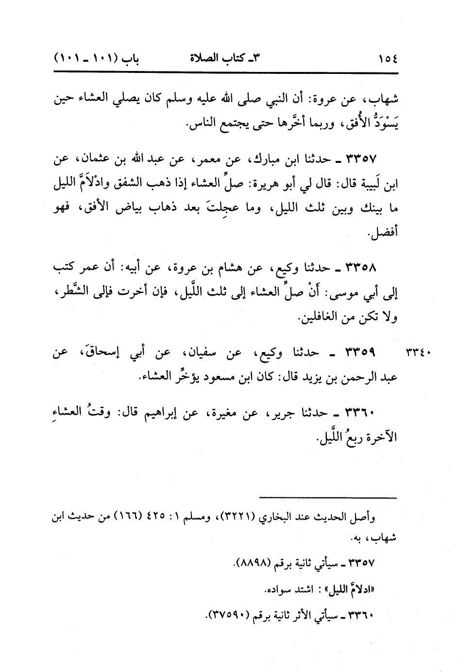 3360- حَدَّثَنَا جَرِيرٌ ، عَنْ مُغِيرَةَ ، عَنْ إبْرَاهِيمَ ، قَالَ : وَقْتُ الْعِشَاءِ الآخِرَةِ رُبْعُ اللَّيْلِ. (1/330).