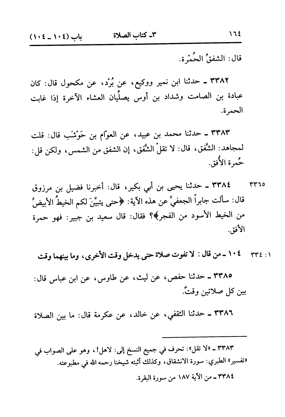 3383- حَدَّثَنَا مُحَمَّدُ بْنُ عُبَيْدٍ ، عَنِ الْعَوَّامِ بْنِ حَوْشَبٍ ، قَالَ : قُلْتُ لِمُجَاهِدٍ : الشَّفَقُ ، قَالَ : لا تَقُلَ الشَّفَقُ ، إنَّ الشَّفَقَ مِنَ الشَّمْسِ ، وَلَكِنْ قُلْ حُمْرَةَ الأُفُقِ. (1/333)