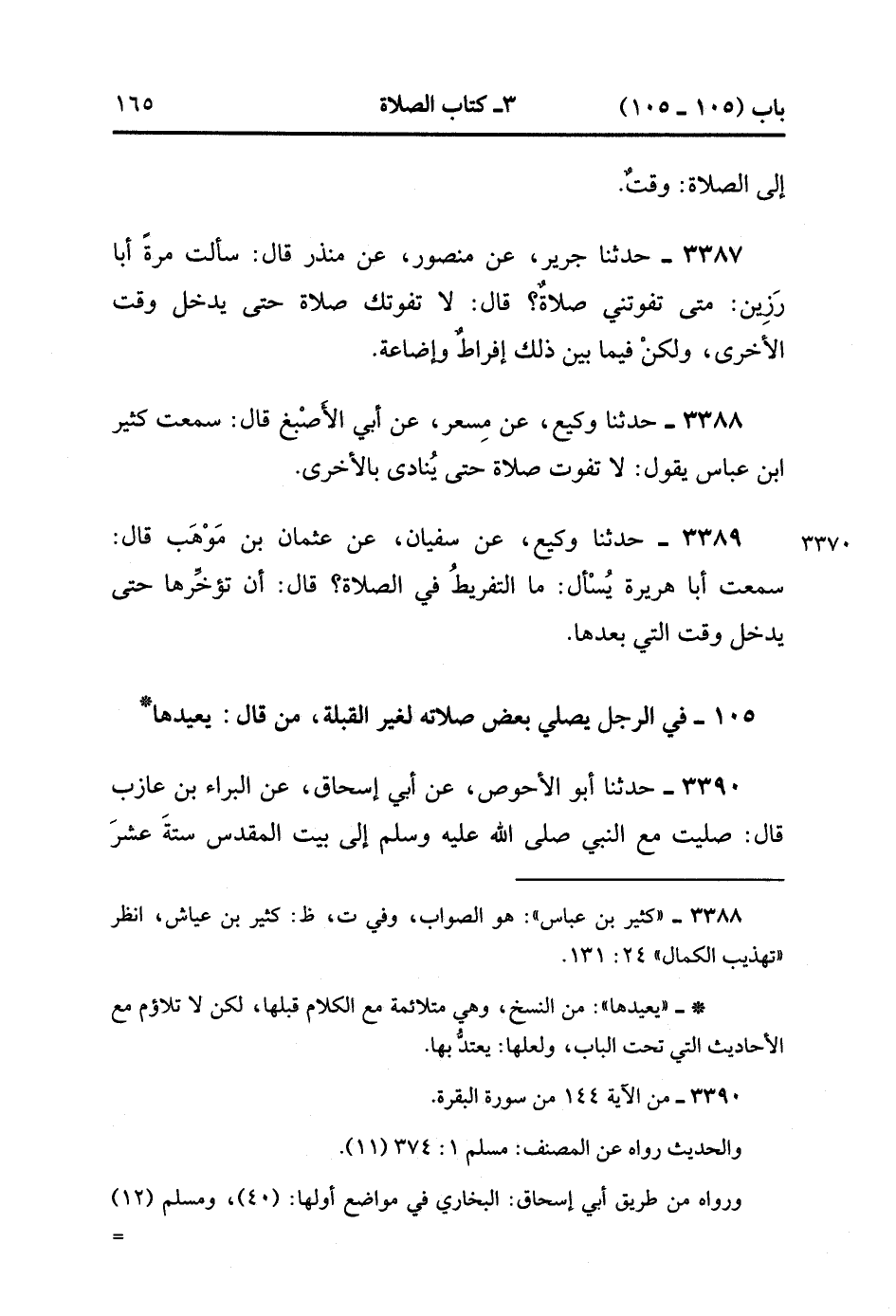 3388- حَدَّثَنَا وَكِيعٌ ، عَنْ مِسْعَرٍ ، عَنْ أَبِي الأَصْبَغِ ، قَالَ : سَمِعْتُ كَثِيرَ بْنَ عَبَّاسٍ يَقُولُ : لا تَفُوتُ صَلاَةٌ حَتَّى يُنَادَى بِالأُخْرَى.