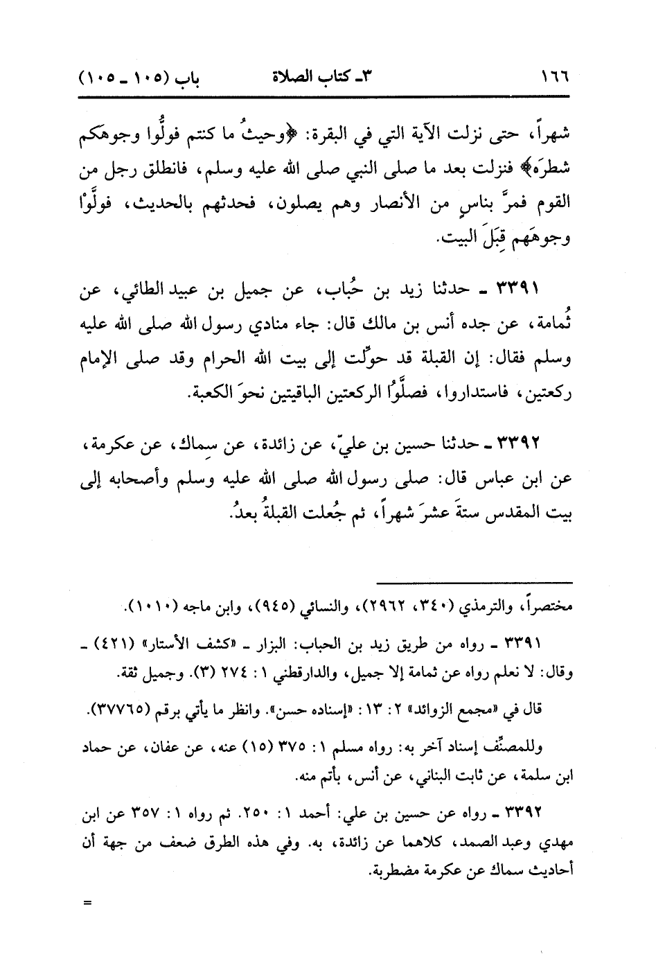 3392- حَدَّثَنَا حُسَيْنُ بْنُ عَلِيٍّ ، عَنْ زَائِدَةَ ، عَنْ سِمَاكٍ ، عَنْ عِكْرِمَةَ ، عَنِ ابْنِ عَبَّاسٍ ، قَالَ : صَلَّى رَسُولُ اللهِ صَلَّى الله عَلَيْهِ وَسَلَّمَ وَأَصْحَابُهُ إلَى بَيْتِ الْمَقْدِسِ سِتَّةَ عَشَرَ شَهْرًا ، ثُمَّ جُعِلَتِ الْقِبْلَةُ بَعْدُ. (1/334).
