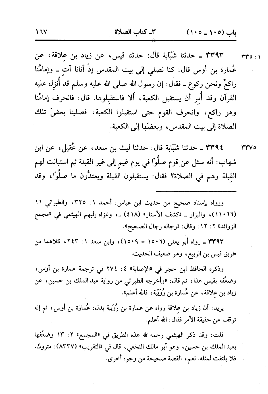 3393- حَدَّثَنَا شَبَابَةُ , قَالَ : حدَّثَنَا قَيْسٌ ، عَنْ زِيَادِ بْنِ عِلاَقَةَ ، عَنْ عُمَارَةَ بْنِ أَوْسٍ ، قَالَ : كُنَّا نُصَلِّي إلَى بَيْتِ الْمَقْدِسِ إذْ أَتَانَا آتٍ - وَإِمَامُنَا رَاكِعٌ ، وَنَحْنُ رُكُوعٌ - فَقَالَ : إنَّ رَسُولَ اللهِ صَلَّى الله عَلَيْهِ وَسَلَّمَ قَدْ أُنْزِلَ عَلَيْهِ القُرْآن ، وَقَدْ أُمِرَ أَنْ يَسْتَقْبِلَ الْكَعْبَةَ أَلاَ فَاسْتَقْبِلُوهَا ، قَالَ : فَانْحَرَفَ إمَامُنَا وَهُوَ رَاكِعٌ ، وَانْحَرَفَ الْقَوْمُ حَتَّى اسْتَقْبَلُوا الْكَعْبَةَ ، فَصَلَّيْنَا بَعْضَ تِلْكَ الصَّلاَةِ إلَى بَيْتِ الْمَقْدِسِ ، وَبَعْضَهَا إلَى الْكَعْبَةِ. (1/334)