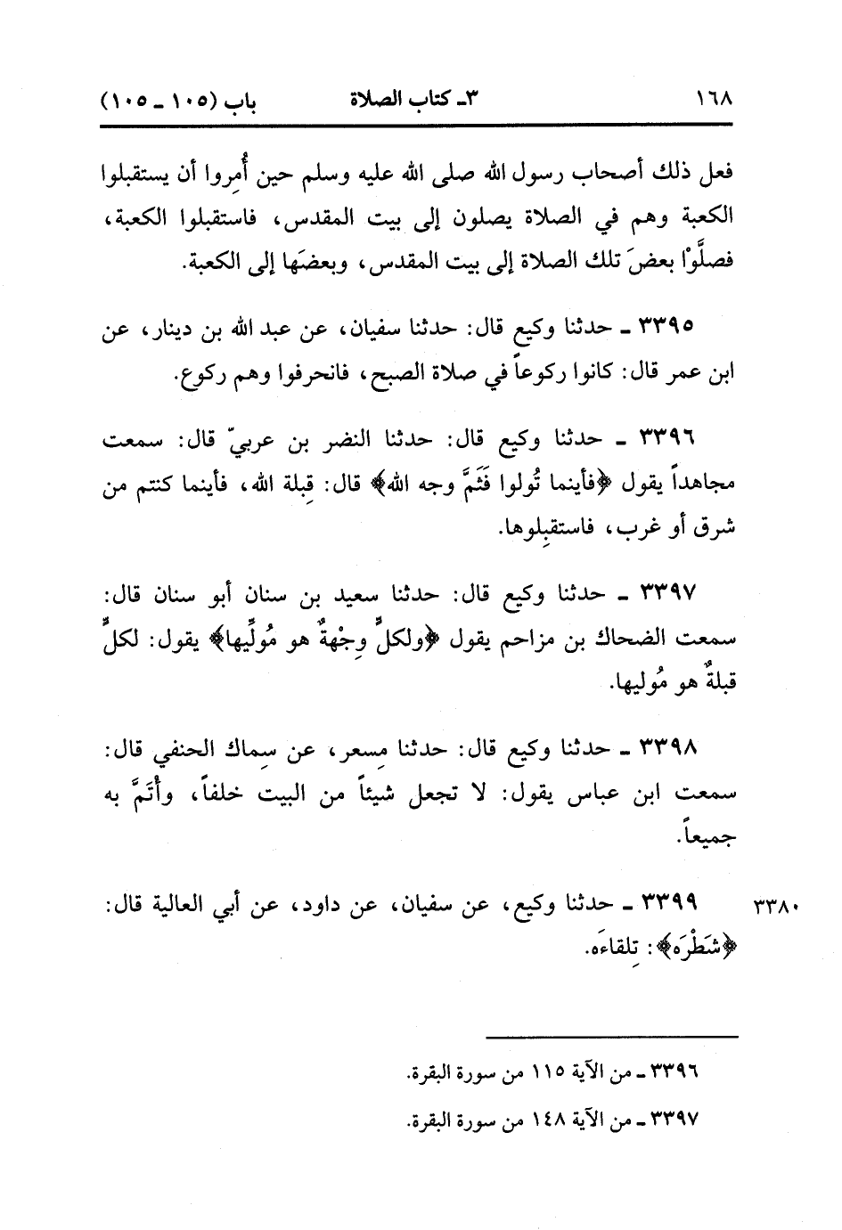 3395- حَدَّثَنَا وَكِيعٌ , قَالَ : حدَّثَنَا سُفْيَانُ ، عَنْ عَبْدِ اللهِ بْنِ دِينَارٍ ، عَنِ ابْنِ عُمَرَ ، قَالَ : كَانُوا رُكُوعًا فِي صَلاَةِ الصُّبْحِ فَانْحَرَفُوا وَهُمْ رُكُوعٌ.