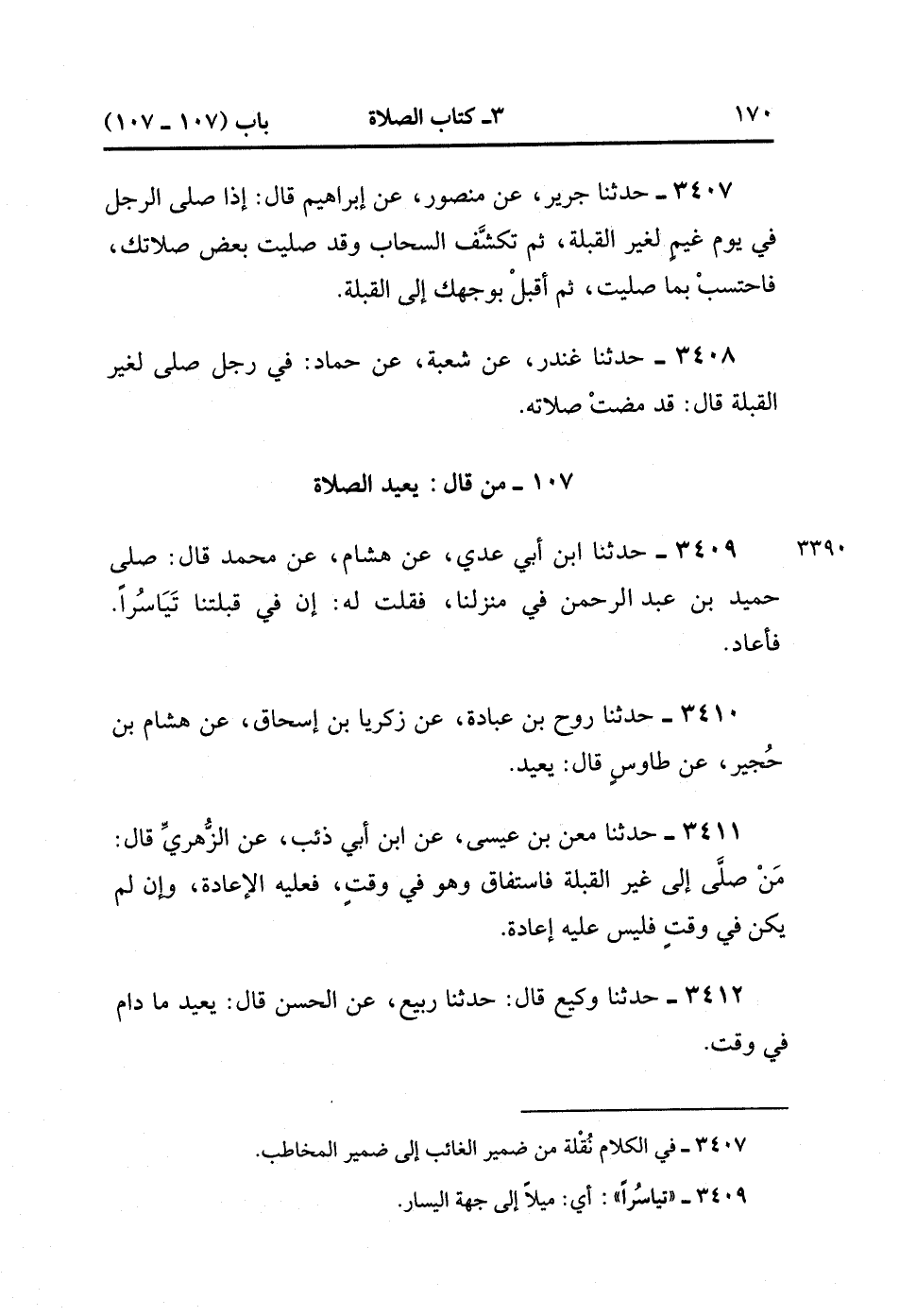 3409- حَدَّثَنَا ابْنُ أَبِي عَدِيٍّ ، عَنْ هِشَامٍ ، عَنْ مُحَمَّدٍ ، قَالَ : صَلَّى حُمَيْدُ بْنُ عَبْدِ الرَّحْمَنِ فِي مَنْزِلِنَا ، فَقُلْتُ لَهُ : إنَّ فِي قِبْلَتِنَا تَيَاسُرًا ، فَأَعَادَ.