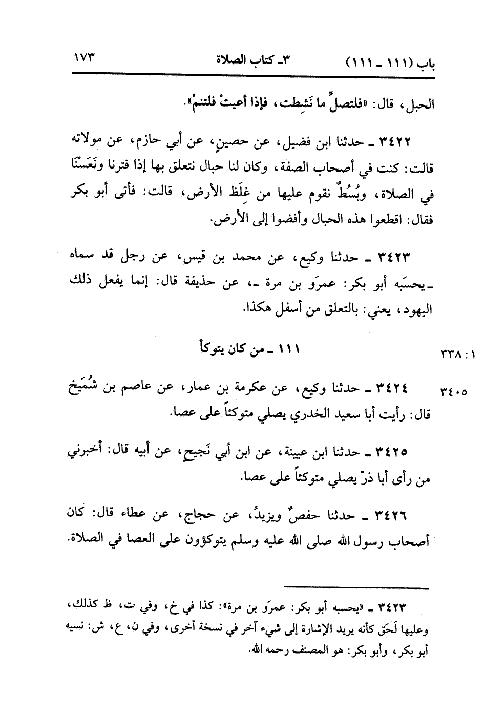 3424- حَدَّثَنَا وَكِيعٌ ، عَنْ عِكْرِمَةَ بن عمَّار ، عَنْ عَاصِمِ بْنِ شُمَيْخٍ ، قَالَ : رَأَيْتُ أَبَا سَعِيدٍ الْخُدْرِيِّ يُصَلِّي مُتَوَكِّئًا عَلَى عَصَا.
