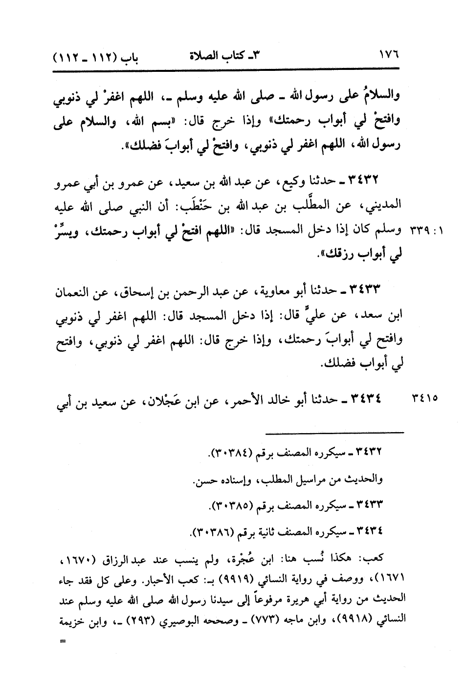 3434- حَدَّثَنَا أَبُو خَالِدٍ الأَحْمَرِِِ ، عَنِ ابْنِ عَجْلاَنَ ، عَنْ سَعِيدِ بْنِ أَبِي سَعِيدٍ ، عَنْ أَبِي هُرَيْرَةَ ، قَالَ : قَالَ لِي كَعْبُ بْنُ عُجْرَةَ : إذَا دَخَلْتَ الْمَسْجِدَ فَسَلِّمْ عَلَى النَّبِيِّ صَلَّى الله عَلَيْهِ وَسَلَّمَ وَقُل : اللَّهُمَّ افْتَحْ لِي أَبْوَابَ رَحْمَتِكَ ، وَإِذَا خَرَجْتَ فَسَلِّمْ عَلَى النَّبِيِّ صَلَّى الله عَلَيْهِ وَسَلَّمَ وَقُل : اللَّهُمَّ احْفَظْنِي مِنَ الشَّيْطَانِ. (1/339).