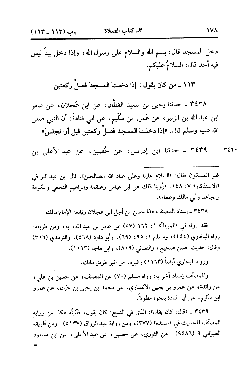 3438- حَدَّثَنَا يَحْيَى بْنُ سَعِيدٍ الْقَطَّانُ ، عَنِ ابْنِ عَجْلاَنَ ، عَنْ عَامِرِ بْنِ عَبْدِ اللهِ بْنِ الزُّبَيْرِ ، عَنْ عَمْرو بْنِ سُلَيْمٍ ، عَنْ أَبِي قَتَادَةَ ؛ أَنَّ النَّبِيَّ صَلَّى الله عَلَيْهِ وَسَلَّمَ ، قَالَ : إذَا دَخَلْتَ الْمَسْجِدَ فَصَلِّ رَكْعَتَيْنِ قَبْلَ أَنْ تَجْلِسَ.