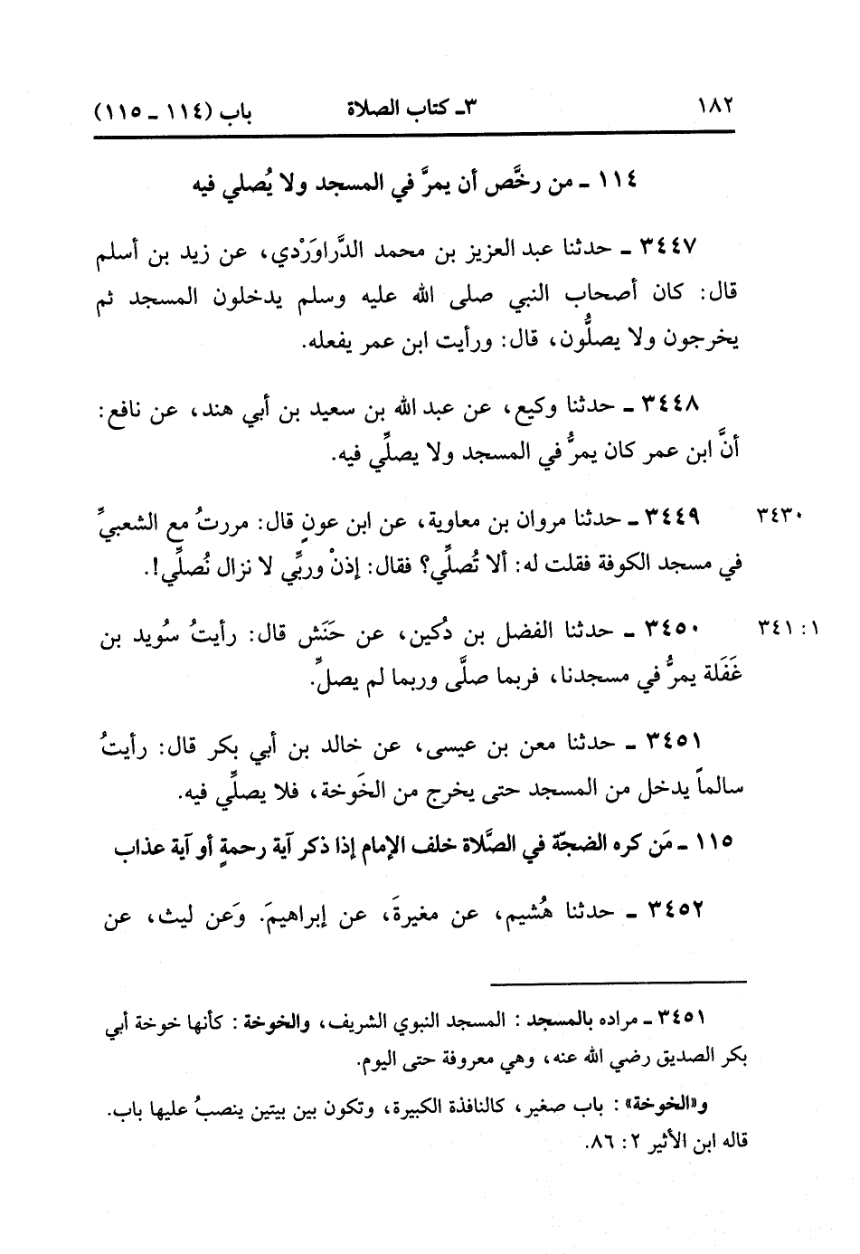 3451- حَدَّثَنَا مَعْنُ بْنُ عِيسَى ، عَنْ خَالِدِ بْنِ أَبِي بَكْرٍ ، قَالَ : رَأَيْتُ سَالِمًا يَدْخُلُ مِنَ الْمَسْجِدِ حَتَّى يَخْرُجَ مِنَ الْخَوْخَةِ فَلاَ يُصَلِّي فِيهِ.