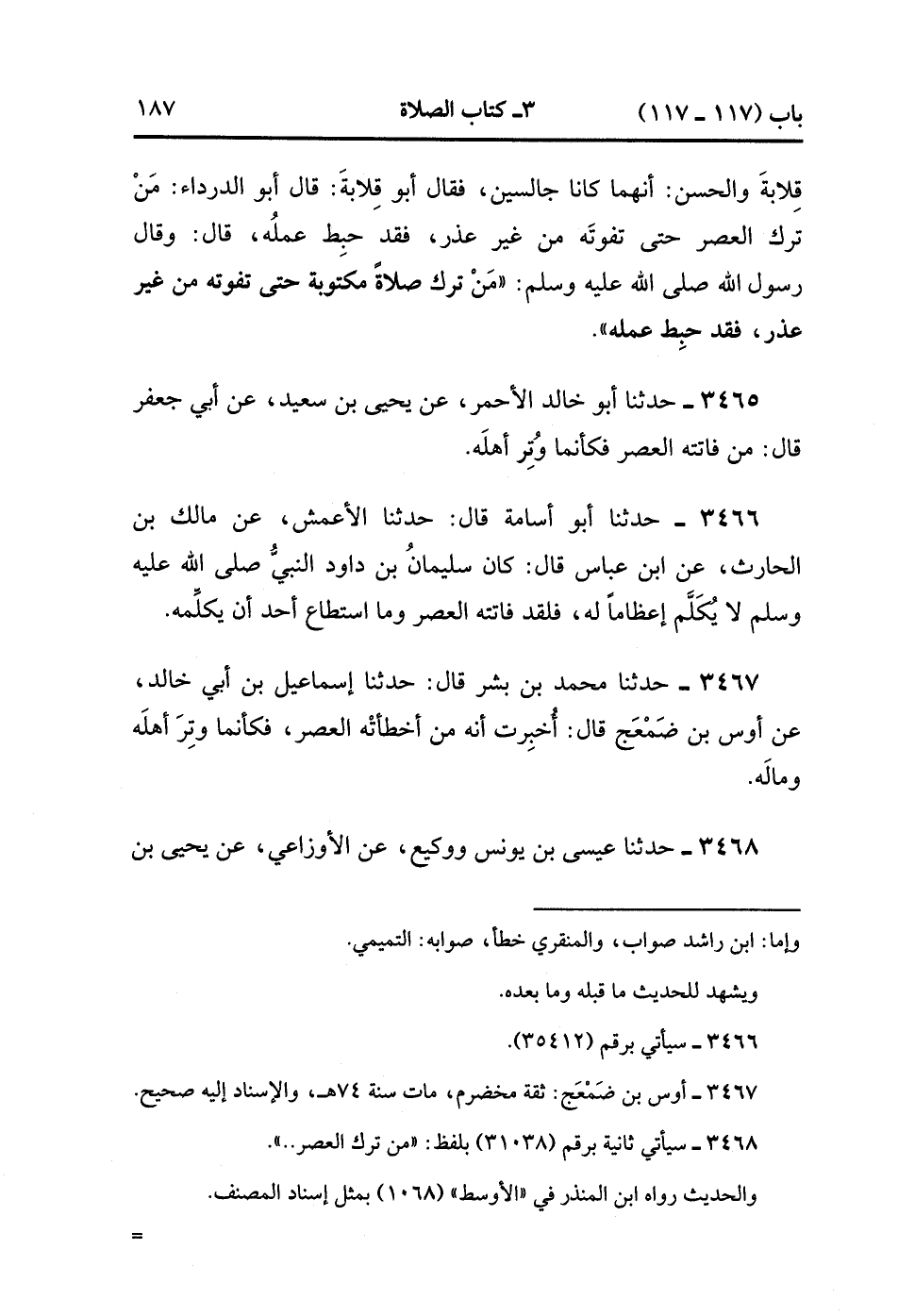 3468- حَدَّثَنَا عِيسَى بْنُ يُونُسَ وَوَكِيعٌ ، عَنِ الأَوْزَاعِيِّ ، عَنْ يَحْيَى بْنِ أَبِي كَثِيرٍ ، عَنْ أَبِي قِلاَبَةَ ، عَنْ أَبِي الْمُهَاجِرِ ، عَنْ بُرَيْدَةَ الأَسْلَمِيِّ ، قَالَ : قَالَ رَسُولُ اللهِ صَلَّى الله عَلَيْهِ وَسَلَّمَ : مَنْ فَاتَتْهُ صَلاَةُ الْعَصْرِ حَبِطَ عَمَلُهُ. (1/342).
