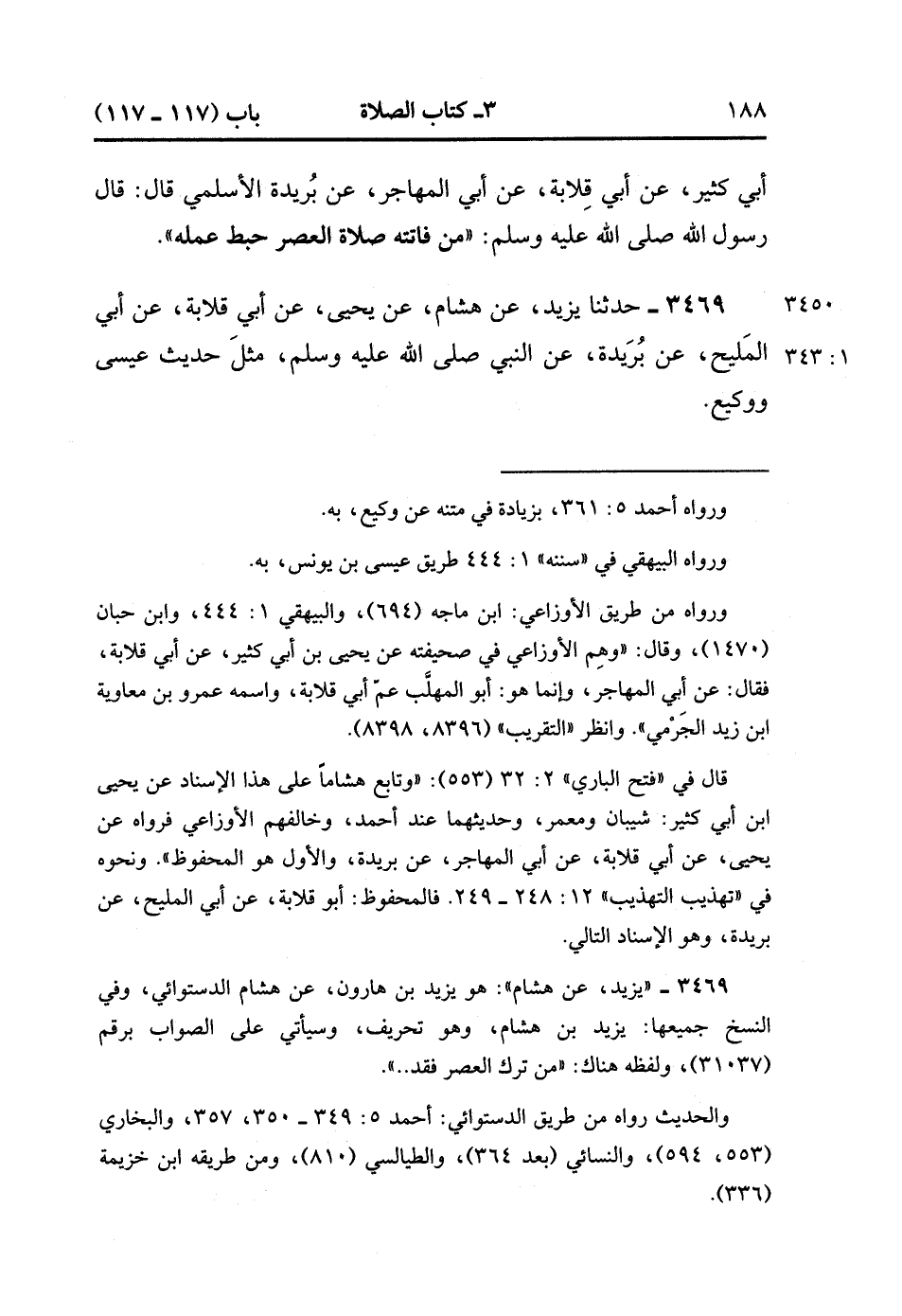 3469- حَدَّثَنَا يَزِيدُ ، عن هِشَامٍ ، عَنْ يَحْيَى ، عَنْ أَبِي قِلاَبَةَ ، عَنْ أَبِي الْمَلِيحِ ، عَنْ بُرَيْدَةَ ، عَنِ النَّبِيِّ صَلَّى الله عَلَيْهِ وَسَلَّمَ ؛ مِثْلَ حَدِيثِ عِيسَى وَوَكِيعٍ. (1/342).