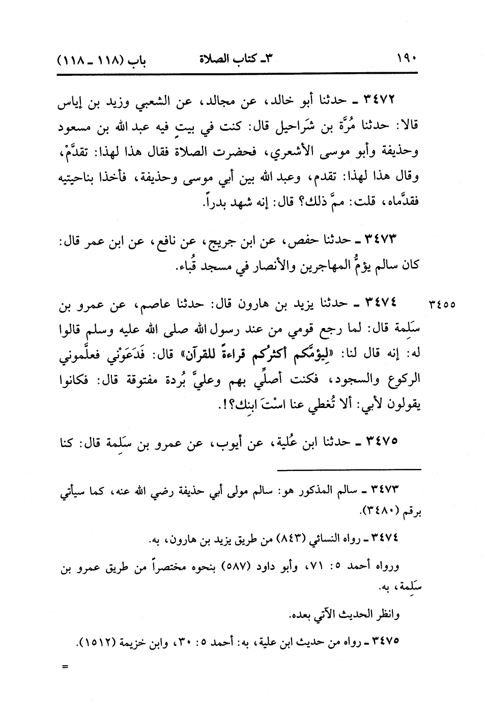 3473- حَدَّثَنَا حَفْصٌ ، عَنِ ابْنِ جُرَيْجٍ ، عَنْ نَافِعٍ ، عَنِ ابْنِ عُمَرَ ، قَالَ : كَانَ سَالِمٌ يَؤُمُّ الْمُهَاجِرِينَ وَالأَنْصَارَ فِي مَسْجِدِ قُبَاءَ.