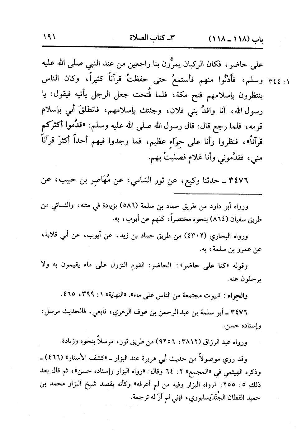 3476- حَدَّثَنَا وَكِيعٌ ، عَنْ ثَوْرٍ الشَّامِيِّ ، عَنْ مُهَاصِرِ بْنِ حَبِيبٍ ، عَنْ أَبِي سَلَمَةَ بْنِ عَبْدِ الرَّحْمَنِ ، قَالَ : قَالَ رَسُولُ اللهِ صَلَّى الله عَلَيْهِ وَسَلَّمَ : إذَا خَرَجَ ثَلاَثَةٌ مُسْلِمِينَ فِي سَفَرٍ فَلْيَؤُمَّهُمْ أَقْرَؤُهُمْ لِكِتَابِ اللهِ ، وَإِنْ كَانَ أَصْغَرَهُمْ ، فَإِذَا أَمَّهُمْ فَهُوَ أَمِيرُهُمْ ، وَذَلِكَ أَمِيرٌ أَمَّرَهُ رَسُولُ اللهِ صَلَّى الله عَلَيْهِ وَسَلَّمَ. (1/344).
