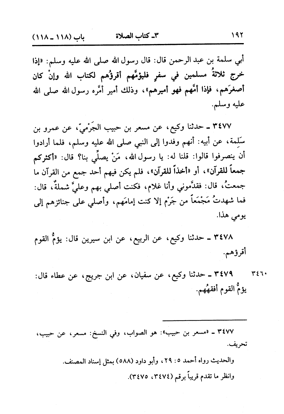 3477- حَدَّثَنَا وَكِيعٌ ، عَنْ مِسْعَرِ بْنِ حَبِيبٍ الْجَرْمِيِّ ، عَنْ عَمْرو بْنِ سَلِمَةَ ، عَنْ أَبِيهِ : أَنَّهُمْ وَفَدُوا إلَى النَّبِيِّ صَلَّى الله عَلَيْهِ وَسَلَّمَ ، فَلَمَّا أَرَادُوا أَنْ يَنْصَرِفُوا قَالُوا : قلْنَا لَهُ : يَا رَسُولَ اللهِ ، مَنْ يُصَلِّي بِنَا ؟ قَالَ : أَكْثَرُكُمْ جَمْعًا لِلْقُرْآنِ ، أَوْ أَخْذًا لِلْقُرْآنِ ، فَلَمْ يَكُنْ فِيهِمْ أَحَدٌ جَمَعَ مِنَ الْقُرْآنِ مَا جَمَعْتُ ، قَالَ : فَقَدَّمُونِي وَأَنَا غُلاَمٌ ، فَكُنْت أُصَلِّي بِهِمْ وَعَلَيَّ شَمْلَةٌ ، قَالَ : فَمَا شَهِدْتُ مَجْمَعًا مِنْ جَرْمٍ إِلاَّ كُنْتُ إمَامَهُمْ ، وَأُصَلِّي عَلَى جَنَائِزَهُمْ إلَى يَوْمِي هَذَا.