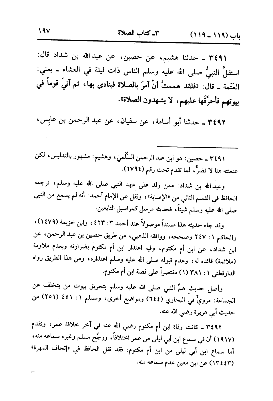 3491- حَدَّثَنَا هُشَيْمٌ ، عَنْ حُصَيْنٍ ، عَنْ عَبْدِ اللهِ بْنِ شَدَّادٍ ، قَالَ : اسْتَقَلَّ النَّبِيُّ صَلَّى الله عَلَيْهِ وَسَلَّمَ النَّاسَ ذَاتَ لَيْلَةٍ فِي الْعِشَاءِ ، يَعْنِي : الْعَتَمَةَ ، قَالَ : فَلَقَدْ هَمَمْتُ أَنْ آمُرَ بِالصَّلاَةِ فَيُنَادَى بِهَا ، ثُمَّ آتِيَ قَوْمًا فِي بُيُوتِهِمْ فَأُحَرِّقَهَا عَلَيْهِمْ ، لا يَشْهَدُونَ الصَّلاَةَ.