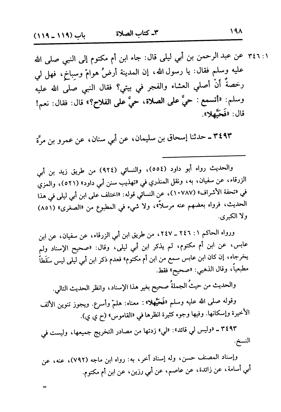 3493- حَدَّثَنَا إِسْحَاقُ بْنُ سُلَيْمَانَ ، عَنْ أَبِي سِنَانٍ ، عَنْ عَمْرو بْنِ مُرَّةَ ، قَالَ : حَدَّثَنِي أَبُو رَزِينٍ ، عَنْ أَبِي هُرَيْرَةَ ، قَالَ : جَاءَ ابْنُ أُمِّ مَكْتُومٍ إلَى رَسُولَ الله صَلَّى الله عَلَيْهِ وَسَلَّمَ ، فَقَالَ : إنِّي رَجُلٌ ضَرِيرٌ شَاسِعُ الدَّارِ ، وَلَيْسَ لِي قَائِدٌ يُلاَوِمُنِي ، فَلِي رُخْصَةٌ أَنْ لا آتِيَ الْمَسْجِدَ ؟ أَوْ كَمَا قَالَ : قَالَ : لاَ. (1/346).