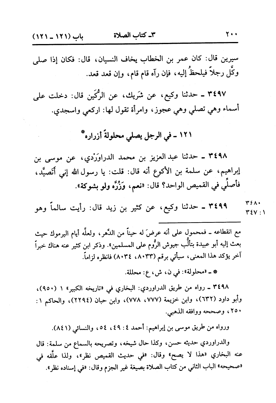 3499- حَدَّثَنَا وَكِيعٌ ، عَنْ كَثِيرِ بْنِ زَيْدٍ ، قَالَ : رَأَيْتُ سَالِمًا وَهُوَ يُصَلِّي مُحَلَّلَةٌ أَزْرَارُهُ. (1/346).