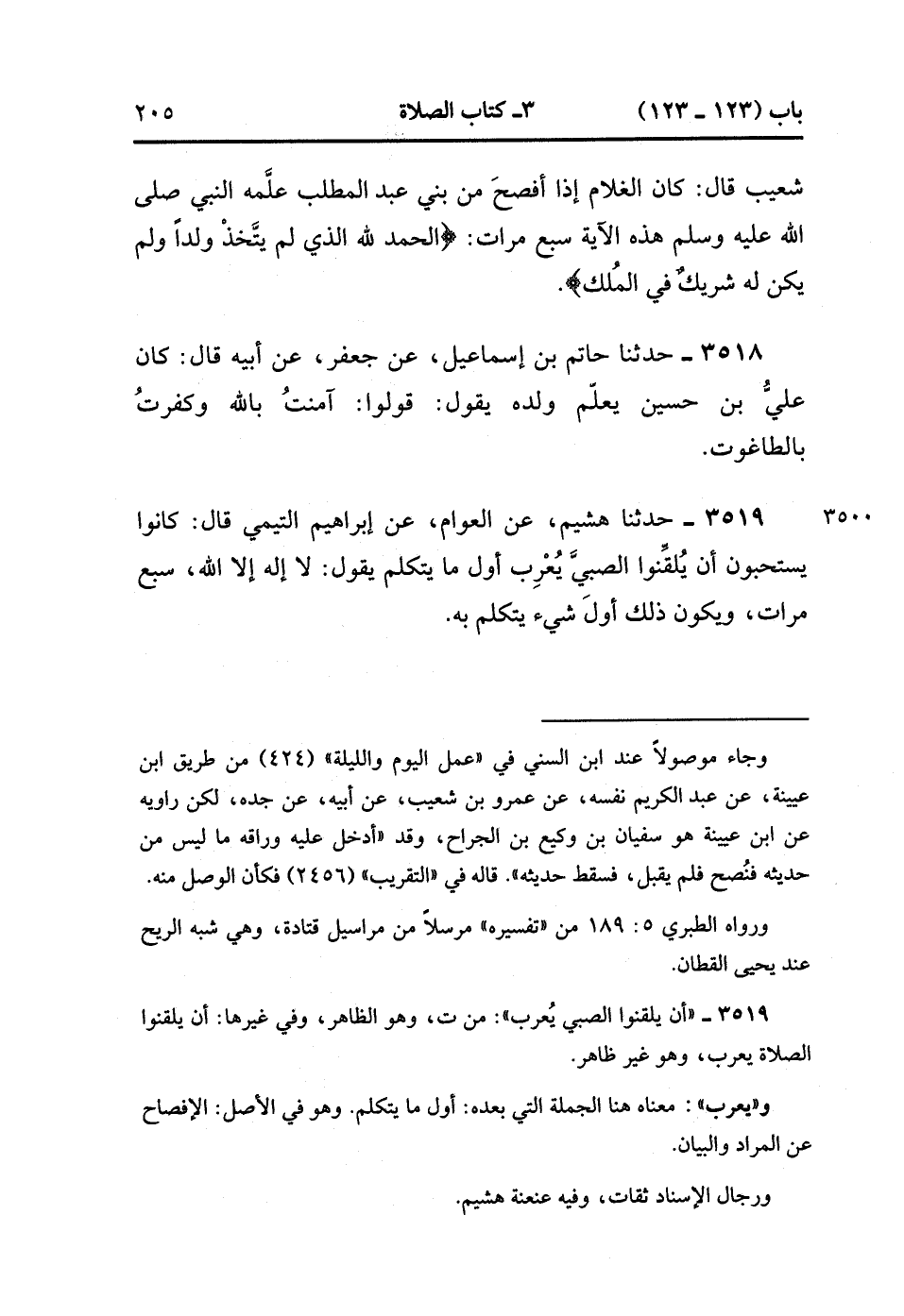 3519- حَدَّثَنَا هُشَيْمٌ ، عَنِ الْعَوَّامِ ، عَنْ إبْرَاهِيمَ التَّيْمِيِّ ، قَالَ : كَانُوا يَسْتَحِبُّونَ أَنْ يُلَقَّنُوا الصَّبِيَّ يُعْرِبُ أَوَّلَ مَا يَتَكَلَّمُ يَقُولُ : لا إلَهَ إِلاَّ اللَّهُ سَبْعَ مَرَّاتٍ وَيَكُونُ ذَلِكَ أَوَّلَ شَيْءٍ يَتَكَلَّمُ بِهِ. (1/348).