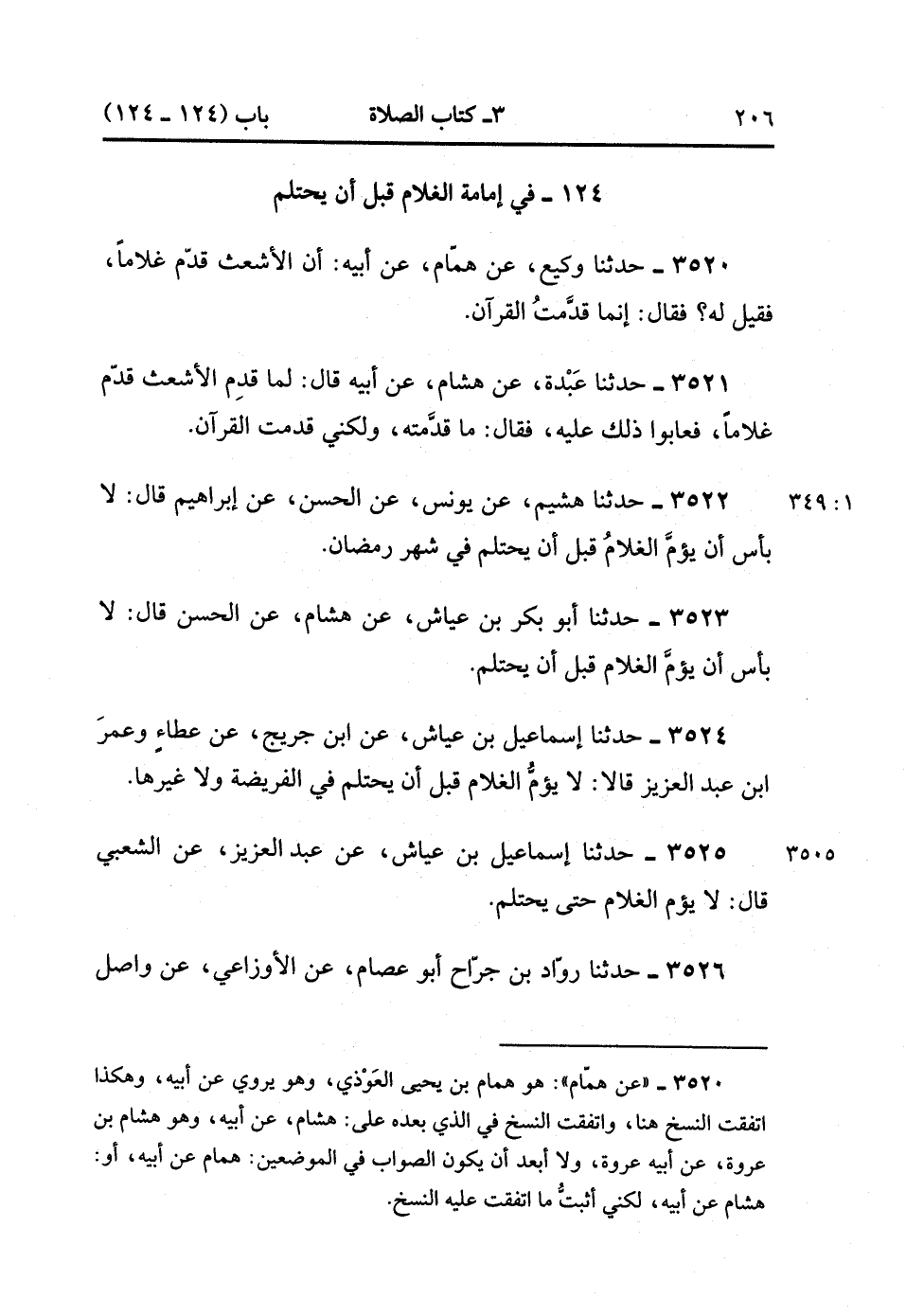 3526- حَدَّثَنَا رَوَّادُ بْنُ جَرَّاحٍ أَبُو عِصَامٍ ، عَنِ الأَوْزَاعِيِّ ، عَنْ وَاصِلِ أَبِي بَكْرٍ ، عَنْ مُجَاهِدٍ ، قَالَ : لا يَؤُمُّ غُلاَمٌ حَتَّى يَحْتَلِمَ. (1/349).