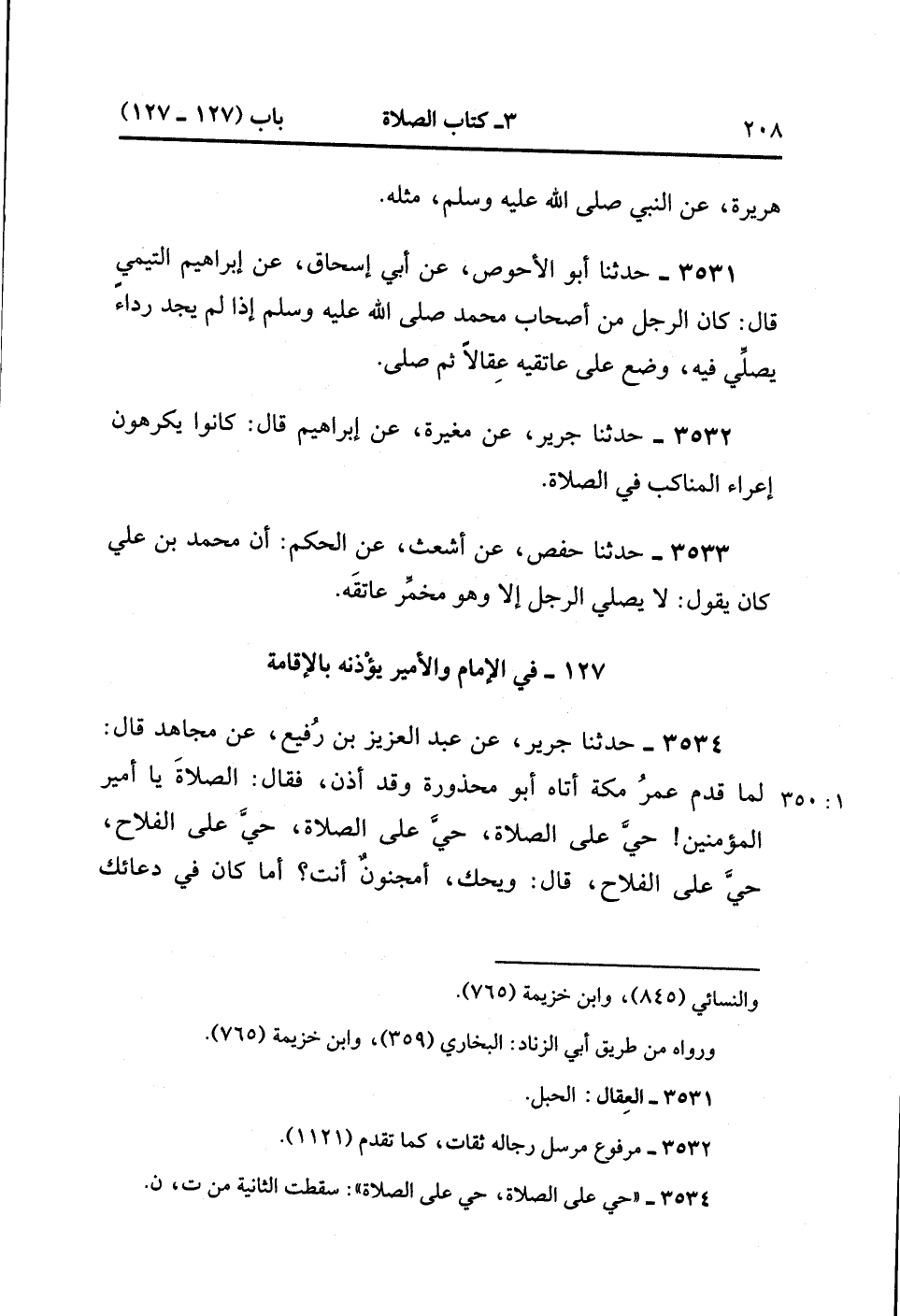 3534- حَدَّثَنَا جَرِيرٌ ، عَنْ عَبْدِ الْعَزِيزِ بْنِ رُفَيْعٍ ، عَنْ مُجَاهِدٍ ، قَالَ : لَمَّا قَدِمَ عُمَرُ مَكَّةَ أَتَاهُ أَبُو مَحْذُورَةَ وَقَدْ أَذَّنَ ، فَقَالَ : الصَّلاَةَ يَا أَمِيرَ الْمُؤْمِنِينَ ، حَيَّ عَلَى الصَّلاَةِ ، حَيَّ عَلَى الصَّلاَةِ ، حَيَّ عَلَى الْفَلاَحِ ، حَيَّ عَلَى الْفَلاَحِ ، قَالَ : وَيْحَك ، أَمَجْنُونٌ أَنْتَ ؟ أَمَا كَانَ فِي دُعَائِكَ الَّذِي دَعَوْتنَا مَا نَأْتِيك حَتَّى تَأْتِيَنَا. (1/349).