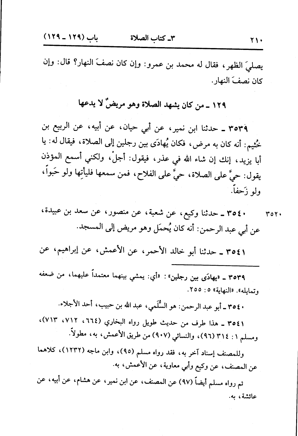3541- حَدَّثَنَا أَبُو خَالِدٍ الأَحْمَرِِِ ، عَنِ الأَعْمَشِ ، عَنْ إبْرَاهِيمَ ، عَنِ الأَسْوَدِ ، عَنْ عَائِشَةَ ، قَالَتْ : لَقَدْ رَأَيْت رَسُولَ اللهِ صَلَّى الله عَلَيْهِ وَسَلَّمَ فِي مَرَضِهِ الَّذِي مَاتَ فِيهِ وَإِنَّهُ ليُهَادَى بَيْنَ رَجُلَيْنِ حَتَّى دَخَلَ فِي الصَّفِّ. (1/350).