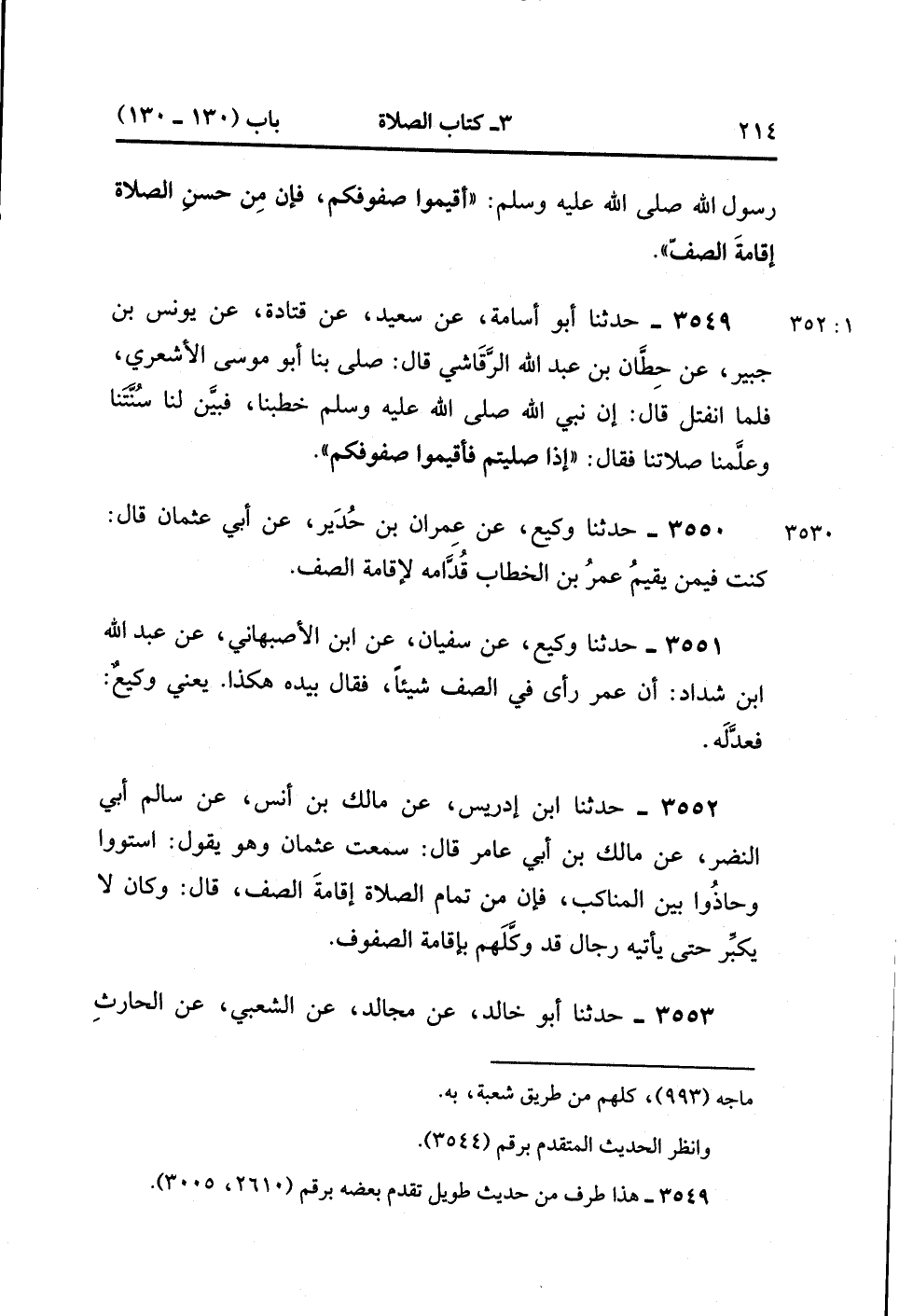 3553- حَدَّثَنَا أَبُو خَالِدٍ ، عَنْ مُجَالِدٍ ، عَنِ الشَّعْبِيِّ ، عَنِ الْحَارِثِ وَأَصْحَابِ عَلِيٍّ قَالُوا : كَانَ عَلِيٌّ يَقُولُ : اسْتَوُوا تَسْتَوِ قُلُوبُكُمْ ، تَرَاصُّوا تَرَاحَمُوا. (1/352).