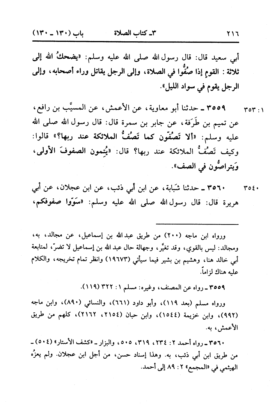 3559- حَدَّثَنَا أَبُو مُعَاوِيَةَ ، عَنِ الأَعْمَشِ ، عَنِ الْمُسَيَّبِ بْنِ رَافِعٍ ، عَنْ تَمِيمِ بْنِ طَرَفَةَ ، عَنْ جَابِرِ بْنِ سَمُرَةَ ، قَالَ : قَالَ رَسُولُ اللهِ صَلَّى الله عَلَيْهِ وَسَلَّمَ : أَلا تَصُفُّونَ كَمَا تَصُفُّ الْمَلاَئِكَةُ عِنْدَ رَبِّهَا ؟ قَالُوا : وَكَيْفَ تَصُفُّ الْمَلاَئِكَةُ عِنْدَ رَبِّهَا ؟ قَالَ : يُتِمُّونَ الصُّفُوفَ الأُولَى ، وَيَتَرَاصُّونَ فِي الصَّفِّ.