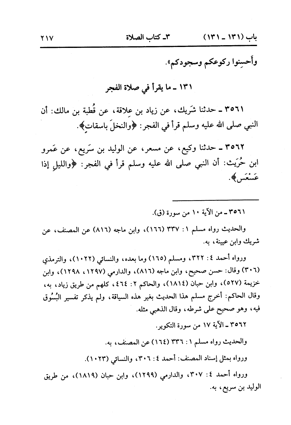 3561- حَدَّثَنَا شَرِيكٌ ، عَنْ زِيَادِ بْنِ عِلاَقَةَ ، عَنْ قُطْبَةَ بْنِ مَالِكٍ : أَنَّ النَّبِيَّ صَلَّى الله عَلَيْهِ وَسَلَّمَ قَرَأَ فِي الْفَجْرِ : {وَالنَّخْلَ بَاسِقَاتٍ}.