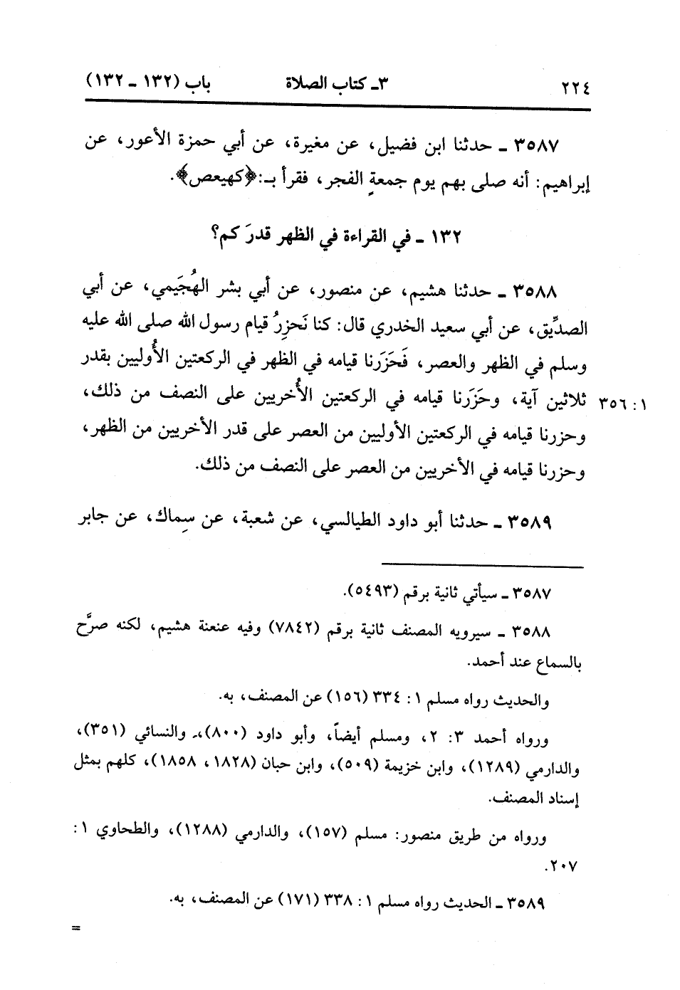 3588- حَدَّثَنَا هُشَيْمٌ ، عَنْ مَنْصُورٍ ، عَنْ أَبِي بِشْرٍ الْهُجَيْمِيِّ ، عَنْ أَبِي الصِّدِّيق ، عَنْ أَبِي سَعِيدٍ الْخُدْرِيِّ ، قَالَ : كُنَّا نَحْزِرُ قِيَامَ رَسُولِ اللهِ صَلَّى الله عَلَيْهِ وَسَلَّمَ فِي الظُّهْرِ وَالْعَصْرِ ، فَحَزَرْنَا قِيَامَهُ فِي الظُّهْرِ فِي الرَّكْعَتَيْنِ الأُولَيَيْنِ بِقَدْرِ ثَلاَثِينَ آيَةً ، وَحَزَرْنَا قِيَامَهُ فِي الرَّكْعَتَيْنِ الأُخْرَيَيْنِ عَلَى النِّصْفِ مِنْ ذَلِكَ ، وَحَزَرْنَا قِيَامَهُ فِي الرَّكْعَتَيْنِ الأُولَيَيْنِ مِنَ الْعَصْرِ عَلَى قَدْرِ الأُخْرَيَيْنِ مِنَ الظُّهْرِ ، وَحَزَرْنَا قِيَامَهُ فِي الأُخْرَيَيْنِ مِنَ الْعَصْرِ عَلَى النِّصْفِ مِنْ ذَلِكَ. (1/355)