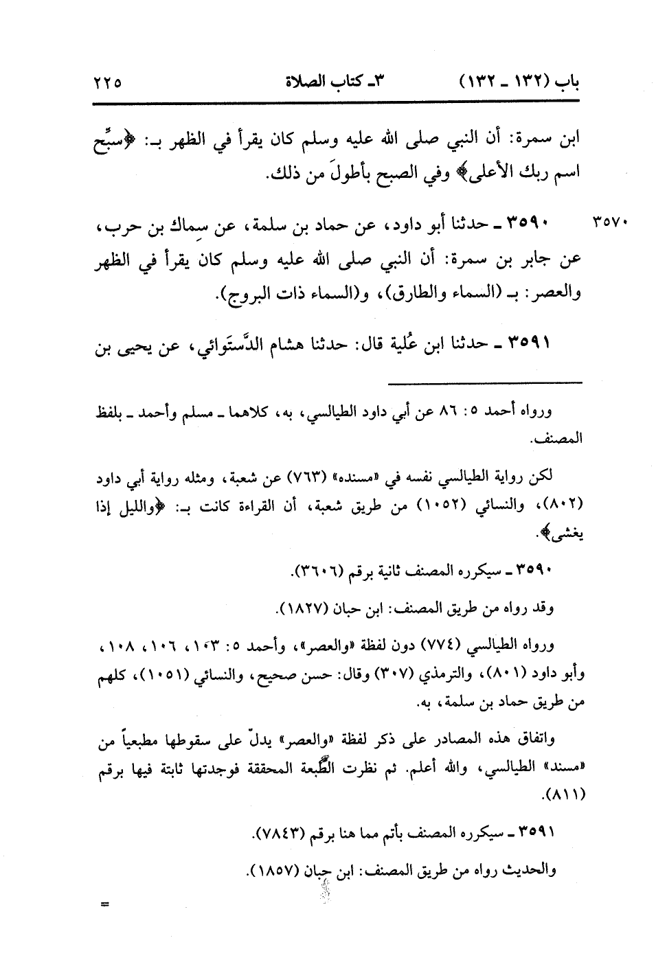 3590- حَدَّثَنَا أَبُو دَاوُدَ ، عَنْ حَمَّادِ بْنِ سَلَمَةَ ، عَنْ سِمَاكٍ بْنِ حَرب ، عَنْ جَابِرِ بْنِ سَمُرَةَ : أَنَّ النَّبِيَّ صَلَّى الله عَلَيْهِ وَسَلَّمَ كَانَ يَقْرَأُ فِي الظُّهْرِ وَالْعَصْرِ بِـ : {السَّمَاءِ وَالطَّارِقِ} ، وَ {وَالسَّمَاءِ ذَاتِ الْبُرُوجِ}.