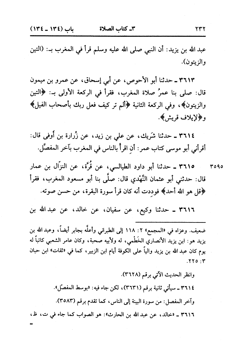 3613- حَدَّثَنَا أَبُو الأَحْوَصِِ ، عَنْ أَبِي إِسْحَاقَ ، عَنْ عَمْرو بْنِ مَيْمُونٍ ، قَالَ : صَلَّى بِنَا عُمَرُ صَلاَةَ الْمَغْرِبِ ، فَقَرَأَ فِي الرَّكْعَةِ الأُولَى بـ : {التِّينِ وَالزَّيْتُونِ} ، وَفِي الرَّكْعَةِ الثَّانِيَةِ : {أَلَمْ تَرَ كَيْفَ فَعَلَ رَبُّك بِأَصْحَابِ الْفِيلِ} ، وَ{لإِيلاَفِ قُرَيْشٍ}.