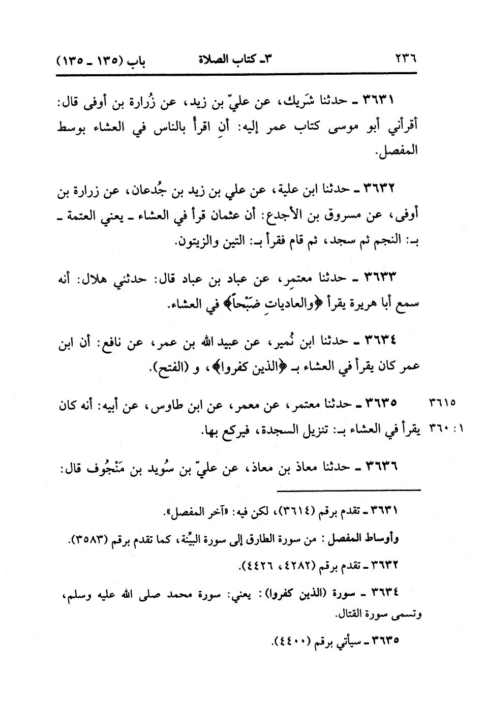 3631- حَدَّثَنَا شَرِيكٌ ، عَنْ عَلِيِّ بْنِ زَيْدٍ ، عَنْ زُرَارَةَ بْنِ أَوْفَى ، قَالَ : أَقْرَأَنِي أَبُو مُوسَى كِتَابَ عُمَرَ إلَيْهِ : أَنِ اقْرَأْ بِالنَّاسِ فِي الْعِشَاءِ بِوَسَطِ الْمُفَصَّلِ.