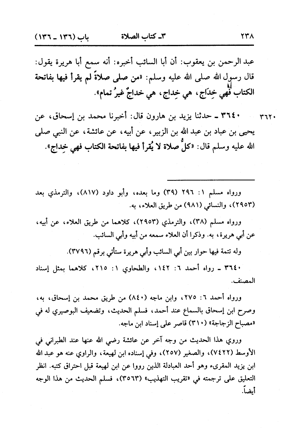 3640- حَدَّثَنَا يَزِيدُ بْنُ هَارُونَ , قَالَ : أَخْبَرَنَا مُحَمَّدُ بْنُ إِسْحَاقَ ، عَنْ يَحْيَى بْنِ عَبَّادِ بْنِ عَبْدِ اللهِ بْنِ الزُّبَيْرِ ، عَنْ أَبِيهِ ، عَنْ عَائِشَةَ ، عَنِ النَّبِيِّ صَلَّى الله عَلَيْهِ وَسَلَّمَ ، قَالَ : كُلُّ صَلاَةٍ لا يُقْرَأُ فِيهَا بِفَاتِحَةِ الْكِتَابِ فَهِيَ خِدَاجٌ. (1/360).
