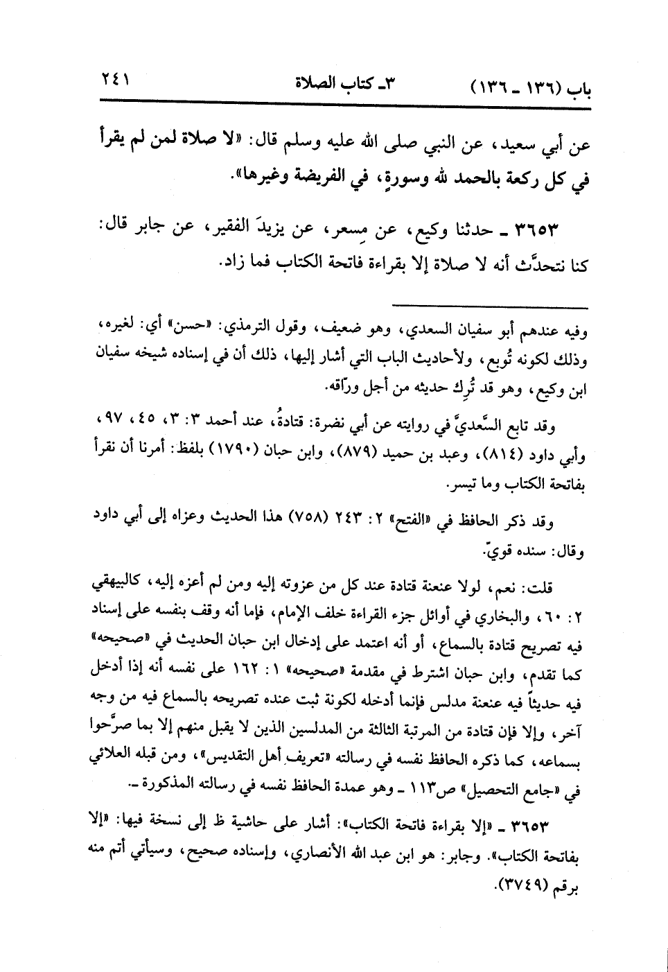 3653- حَدَّثَنَا وَكِيعٌ ، عَنْ مِسْعَرٍ ، عَنْ يَزِيدَ الْفَقِيرِ ، عَنْ جَابِرٍ ، قَالَ : كُنَّا نَتَحَدَّثُ أَنَّهُ لا صَلاَةَ إِلاَّ بِقِرَاءَةِ فَاتِحَةِ الْكِتَابِ فَمَا زَادَ. (1/361).