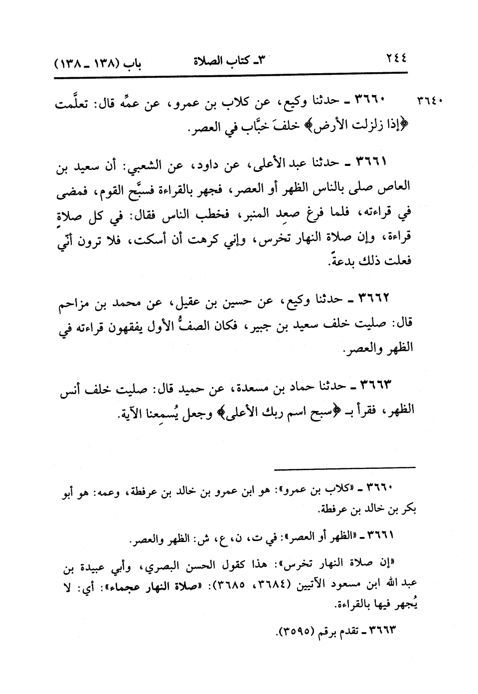 3661- حَدَّثَنَا عَبْدُ الأَعْلَى ، عَنْ دَاوُدَ ، عَنِ الشَّعْبِيِّ : أَنَّ سَعِيدَ بْنِ الْعَاصِ صَلَّى بِالنَّاسِ الظُّهْرَ أَو الْعَصْرَ ، فَجَهَرَ بِالْقِرَاءَةِ فَسَبَّحَ الْقَوْمُ ، فَمَضَى فِي قِرَاءَتِهِ ، فَلَمَّا فَرَغَ صَعِدَ الْمِنْبَرَ ، فَخَطَبَ النَّاسَ ، فَقَالَ : فِي كُلِّ صَلاَةٍ قِرَاءَةٌ ، وَإِنَّ صَلاَةَ النَّهَارِ تَخَرَس ، وَإِنِّي كَرِهْت أَنْ أَسْكُتَ فَلاَ تَرَوْنَ أَنِّي فَعَلْت ذَلِكَ بِدْعَةً.