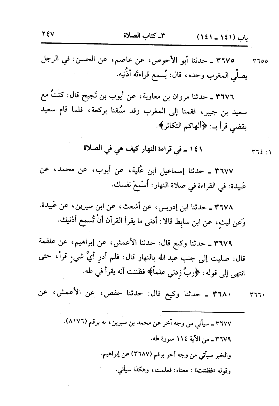 3679- حَدَّثَنَا وَكِيعٌ , قَالَ : حدَّثَنَا الأَعْمَشُ ، عَنْ إِبْرَاهِيمَ ، عَنْ عَلْقَمَةَ ، قَالَ : صَلَّيْت إلَى جَنْبِ عَبْدِ اللهِ بِالنَّهَارِ فَلَمْ أَدْرِ أَيَّ شَيْءٍ قَرَأَ ، حَتَّى انْتَهَى إلَى قَوْلِهِ : {رَبِّ زِدْنِي عِلْمًا} فَظَنَنْت أَنَّهُ يَقْرَأُ فِي طَه.