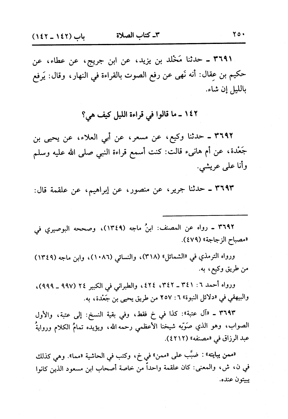 3693- حَدَّثَنَا جَرِيرٌ ، عَنْ مَنْصُورٍ ، عَنْ إِبْرَاهِيمَ ، عَنْ عَلْقَمَةَ ، قَالَ : قالُوا لَهُ : كَيْفَ كَانَتْ قِرَاءَةُ عَبْدِ اللهِ بِاللَّيْلِ ؟ فَقَالَ : كَانَ يُسْمِعُ أَحْيَانًا آلِ عُتْبَةٍ ، قَالَ : وَكَانُوا فِي حُجْرَةٍ بَيْنَ يَدَيْهِ ، وَكَانَ عَلْقَمَةُ مِمَّنْ يُبَايِتُهُ. (1/365).