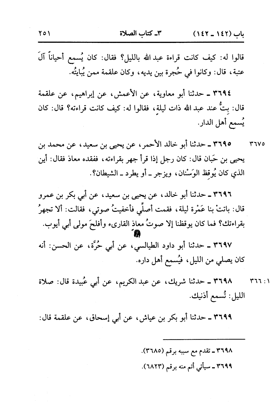 3699- حَدَّثَنَا أَبُو بَكْرِ بْنُ عَيَّاشٍ ، عَنْ أَبِي إِسْحَاقَ ، عَنْ عَلْقَمَةَ ، قَالَ : صَلَّيْتُ مَعَ عَبْدِ اللهِ لَيْلَةً كُلَّهَا ، فَكَانَ يَرْفَعُ صَوْتَهُ ، يَقْرَأُ قِرَاءَةً يُسْمِعُ أَهْلَ الْمَسْجِدِ ، يُرَتِّلُ وَلا يُرَجِّعُ. (1/366).