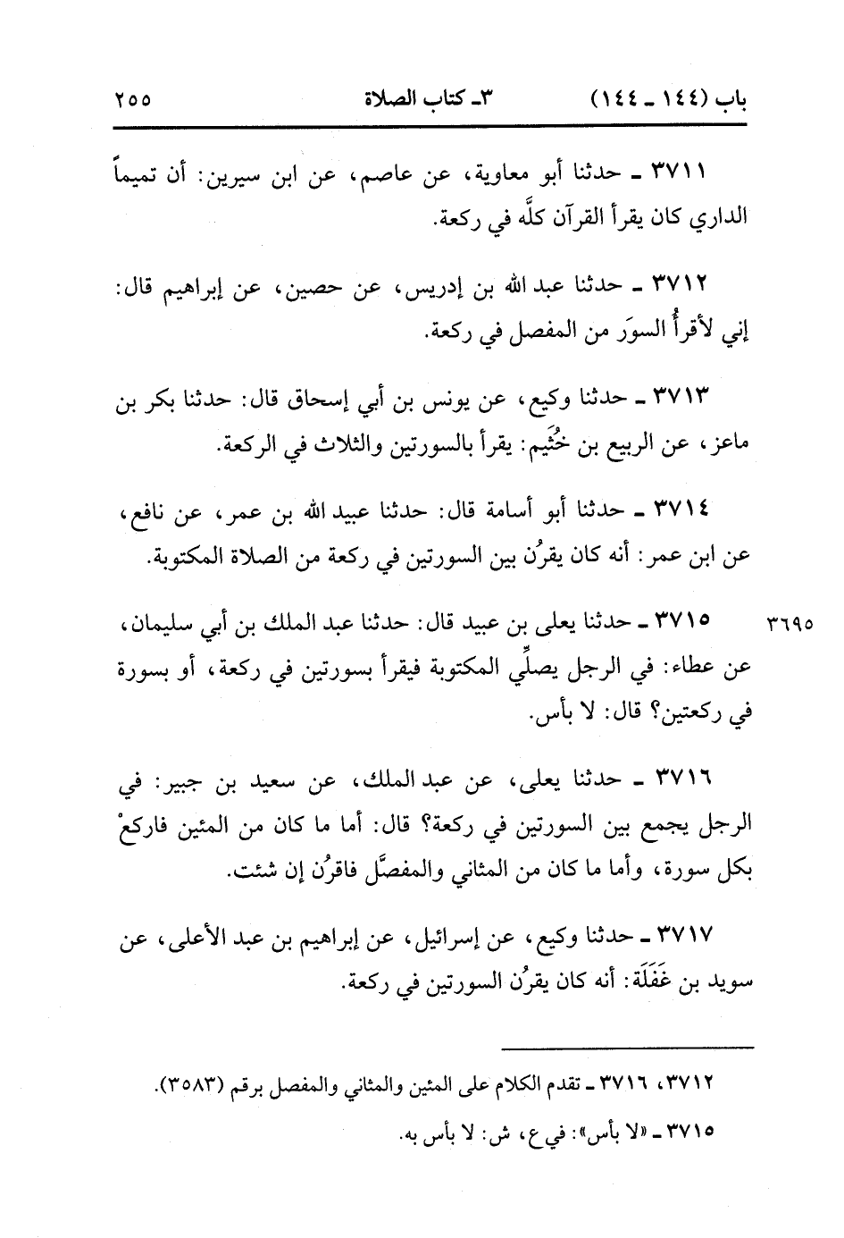 3713- حَدَّثَنَا وَكِيعٌ ، عَنْ يُونُسَ بْنِ أَبِي إِسْحَاقَ , قَالَ : حدَّثَنَا بَكْرُ بْنُ مَاعِزٍ ، عَنِ الرَّبِيعِ بْنِ خُثَيْمٍ : يَقَرَأَ بالسُّورَتَيْنِ وَالثَّلاَثَ فِي الرَّكْعَةِ.
