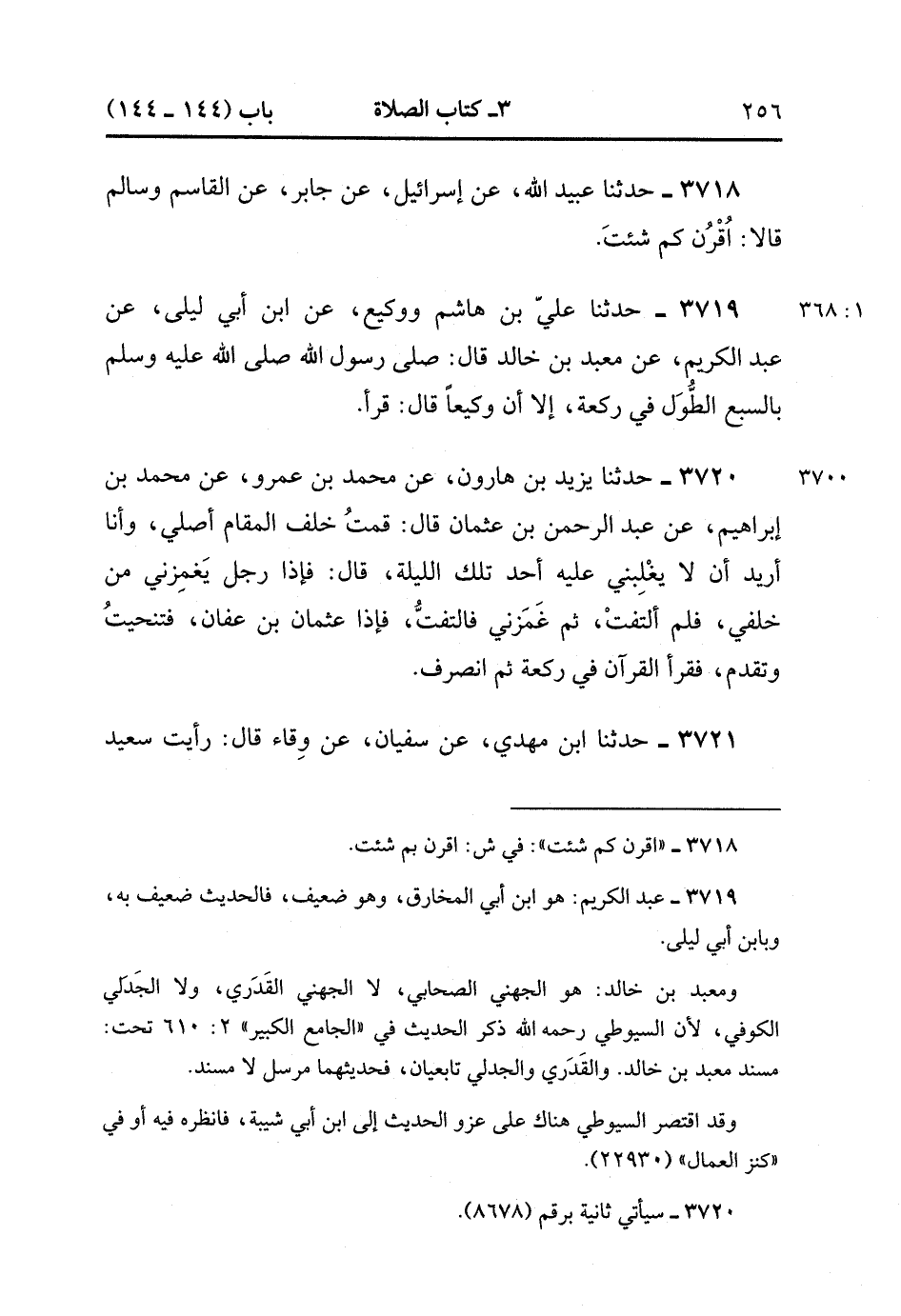3720- حَدَّثَنَا يَزِيدُ بْنُ هَارُونَ ، عَنْ مُحَمَّدِ بْنِ عَمْرٍو ، عَنْ مُحَمَّدِ بْنِ إِبْرَاهِيمَ ، عَنْ عَبْدِ الرَّحْمَنِ بْن عُثْمَانَ ، قَالَ : قمْتُ خَلْفَ الْمَقَامِ أُصَلِّي ، وَأَنَا أُرِيدُ أَنْ لا يَغْلِبَنِي عَلَيْهِ أَحَدٌ تِلْكَ اللَّيْلَةَ ، قَالَ : فَإِذَا رَجُلٌ يَغْمِزُنِي مِنْ خَلْفِي ، فَلَمْ أَلْتَفِتْ ، ثُمَّ غَمَزَنِي فَالْتَفَتُّ ، فَإِذَا عُثْمَانَ بْنُ عَفَّانَ ، فَتَنَحَّيْتُ وَتَقَدَّمَ ، فَقَرَأَ الْقُرْآنَ فِي رَكْعَةٍ ثُمَّ انْصَرَفَ.