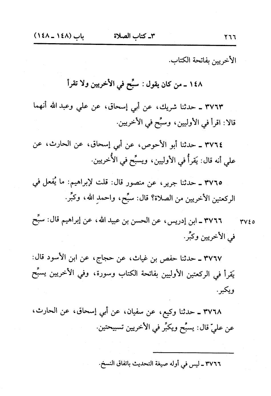 3768- حَدَّثَنَا وَكِيعٌ ، عَنْ سُفْيَانَ ، عَنْ أَبِي إِسْحَاقَ ، عَنِ الْحَارِثِ ، عَنْ عَلِيٍّ ، قَالَ : يُسَبِّحُ وَيُكَبِّرُ فِي الأُخْرَيَيْنِ تَسْبِيحَتَيْنِ. (1/372).
