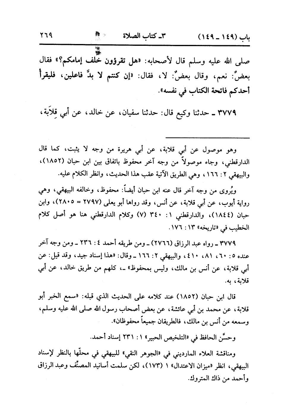 3778- حَدَّثَنَا هُشَيْمٌ ، قَالَ : أَخْبَرَنَا خَالِدٌ ، عَنْ أَبِي قِلاَبَةَ ؛ أَنَّ رَسُولَ اللهِ صَلَّى الله عَلَيْهِ وَسَلَّمَ قَالَ لأَصْحَابِهِ : هَلْ تَقْرَؤُونَ خَلْفَ إمَامِكُمْ ؟ فَقَالَ بَعْضٌ : نَعَمْ ، وَقَالَ بَعْضٌ : لا ، فَقَالَ : إِنْ كُنْتُمْ لا بُدَّ فَاعِلِينَ ، فَلْيَقْرَأْ أَحَدُكُمْ فَاتِحَةَ الْكِتَابِ فِي نَفْسِهِ.