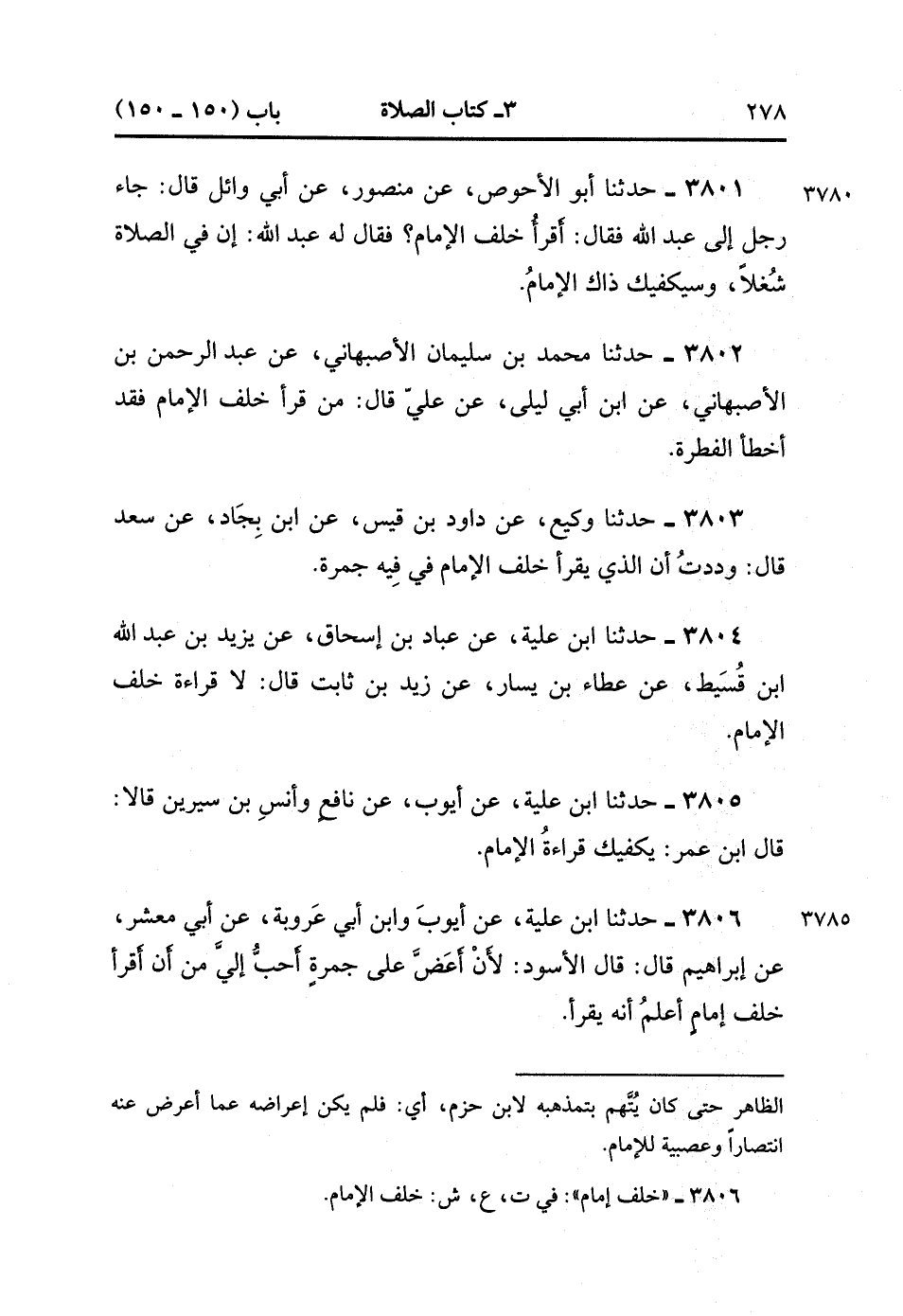 3806- حَدَّثَنَا ابْنُ عُلَيَّةَ ، عَنْ أَيُّوبَ وَابْنِ أَبِي عَرُوبَةَ ، عَنْ أَبِي مَعْشَرٍ ، عَنْ إبْرَاهِيمَ ، قَالَ : قَالَ الأَسْوَدُ : لأَنْ أَعَضَّ عَلَى جَمْرَةٍ أَحَبُّ إِلَيَّ مِنْ أَنْ أَقْرَأَ خَلْفَ إِمَامٍ أَعْلَمُ أَنَّهُ يَقْرَأُ. (1/376).