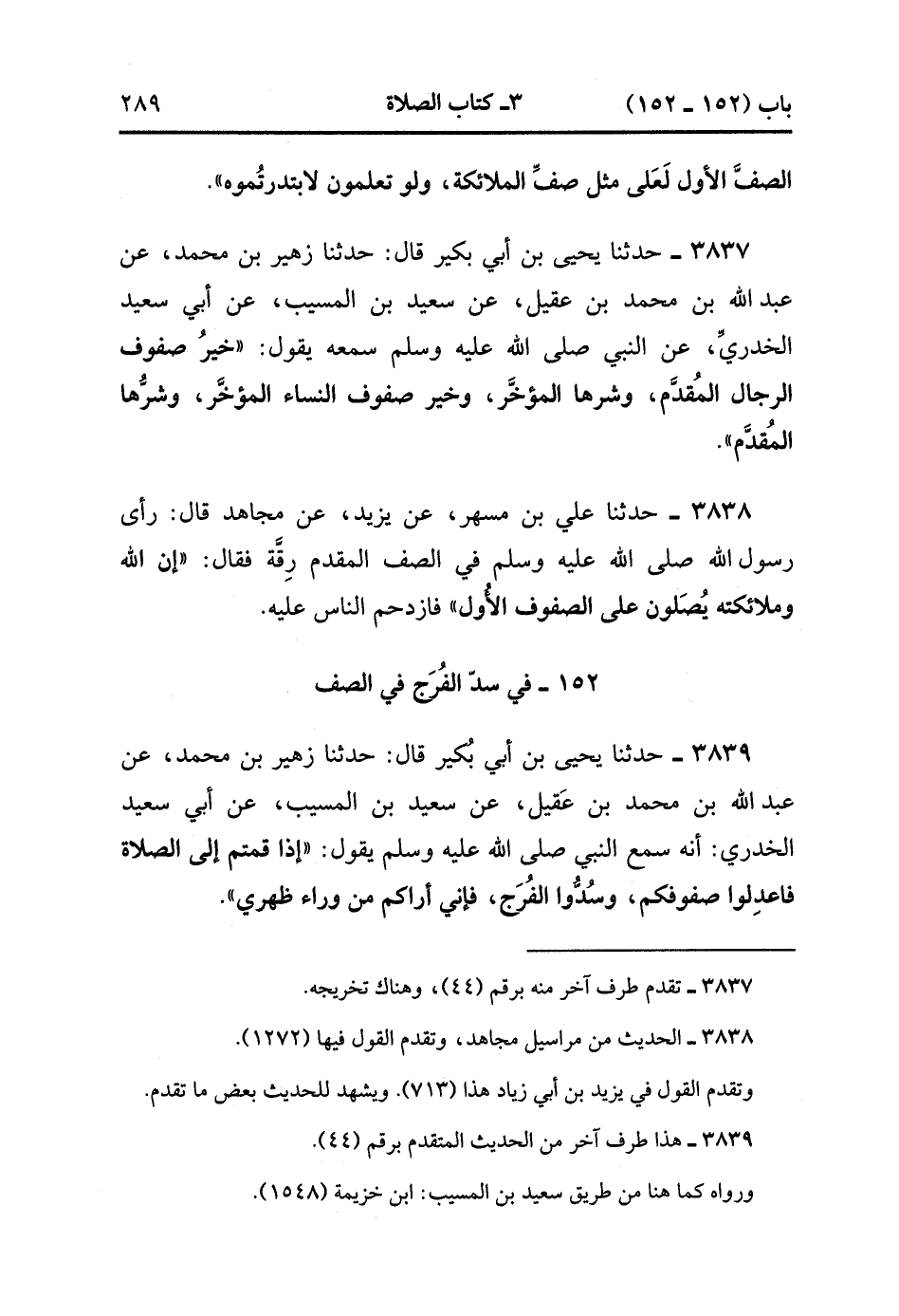 3837- حَدَّثَنَا يَحْيَى بْنُ أَبِي بُكَيْرٍ , قَالَ : حدَّثَنَا زُهَيْرُ بن محمدٍ ، عَنْ عَبْدِ اللهِ بْنِ مُحَمَّدِ بْنِ عَقِيلٍ ، عَنْ سَعِيدِ بْنِ الْمُسَيَّبِ ، عَنْ أَبِي سَعِيدٍ الْخُدْرِيِّ ، عَنِ النَّبِيِّ صَلَّى الله عَلَيْهِ وَسَلَّمَ سَمِعَهُ يَقُولُ : خَيْرُ صُفُوفِ الرِّجَالِ الْمُقَدَّمُ ، وَشَرُّهَا الْمُؤَخَّرُ ، وَخَيْرُ صُفُوفِ النِّسَاءِ الْمُؤَخَّرُ ، وَشَرُّهَا الْمُقَدَّمُ.