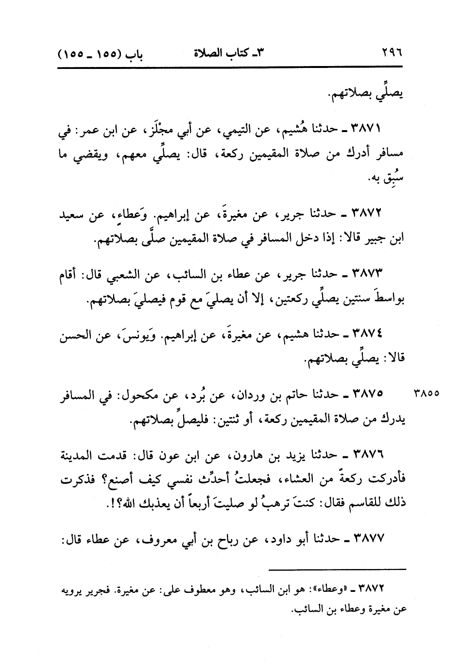 3873- حَدَّثَنَا جَرِيرٌ ، عَنْ عَطَاءِ بْنِ السَّائِبِ ، عَنِ الشَّعْبِيِّ ، قَالَ : أَقَامَ بِوَاسِطٍ سَنَتَيْنِ يُصَلِّي رَكْعَتَيْنِ ، إِلاَّ أَنْ يُصَلِّيَ مَعَ قَوْمٍ فَيُصَلِّيَ بِصَلاَتِهِم.
