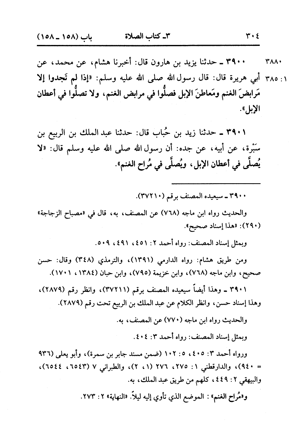 3901- حَدَّثَنَا زَيْدُ بْنُ حُبَابٍ , قَالَ : حدَّثَنَا عَبْدُ الْمَلِكِ بْنِ الرَّبِيعِ بْنِ سَبْرَةَ ، عَنْ أَبِيهِ ، عَنْ جَدِّهِ ، أَنَّ رَسُولَ اللهِ صَلَّى الله عَلَيْهِ وَسَلَّمَ ، قَالَ : لا يُصَلَّى فِي أَعْطَانِ الإِبِلِ وَيُصَلَّى مُرَاحِ الْغَنَمِ. (1/385).