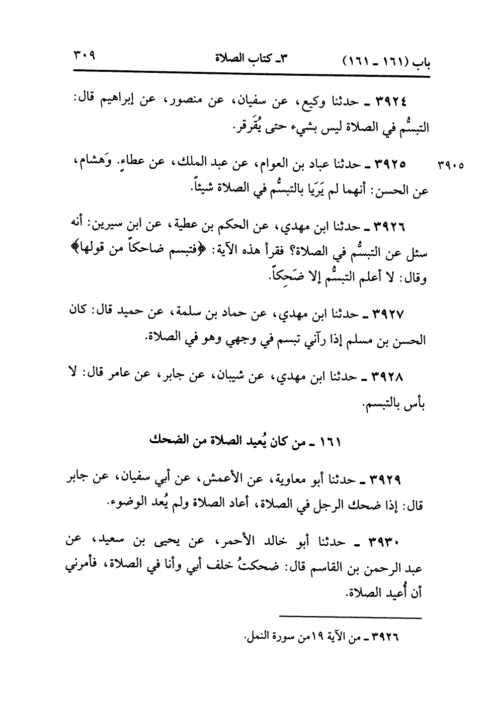 3926- حَدَّثَنَا ابْنُ مَهْدِيٍّ ، عَنِ الْحَكَمِ بْنِ عَطِيَّةَ ، عَنِ ابْنِ سِيرِينَ : أَنَّهُ سُئِلَ عَنِ التَّبَسُّمِ فِي الصَّلاَةِ ؟ فَقَرَأَ هَذِهِ الآيَةَ : {فَتَبَسَّمَ ضَاحِكًا مِنْ قَوْلِهَا} وقال : لا أَعْلَمُ التَّبَسُّمَ إِلاَّ ضَحِكًا.