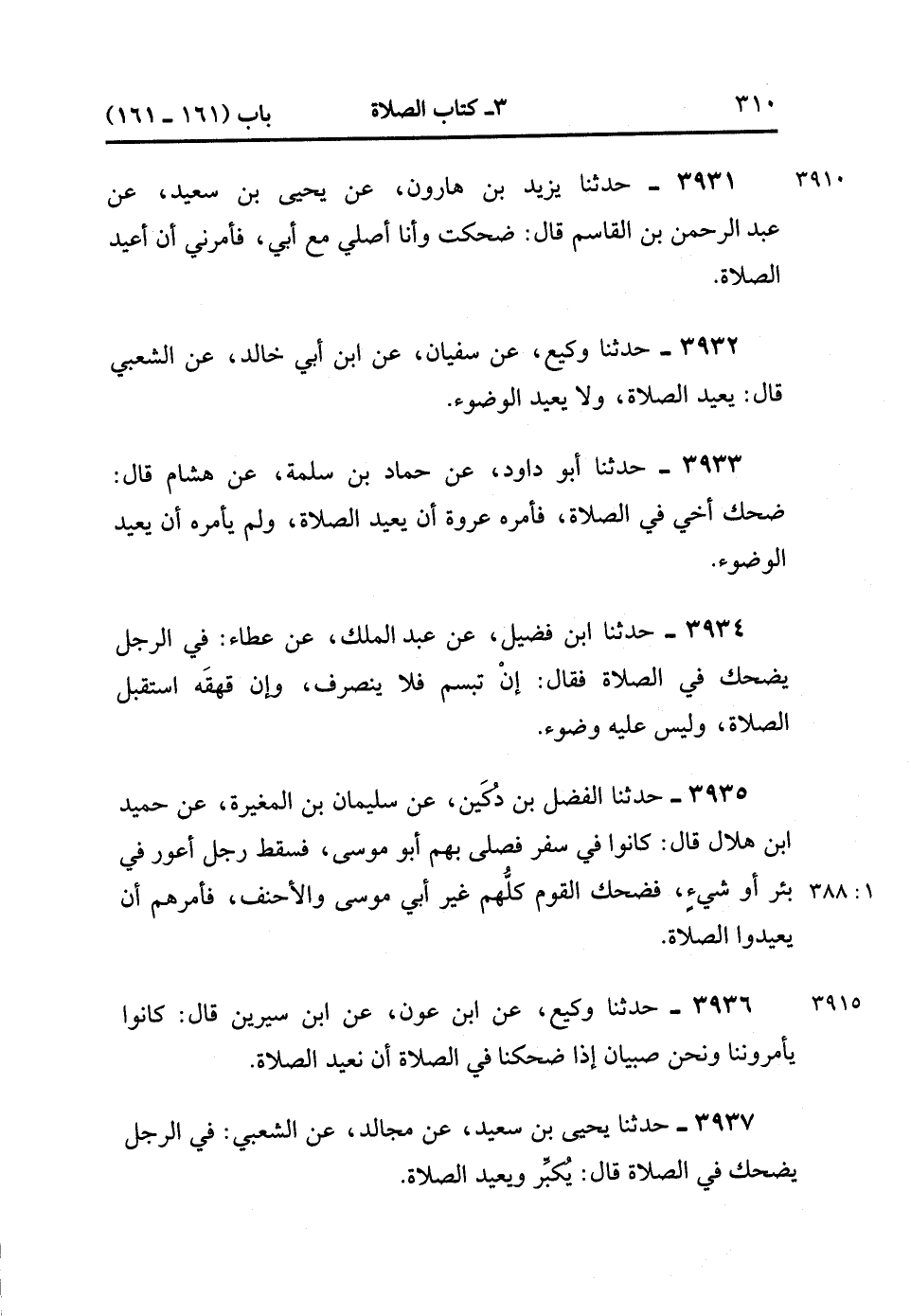 3937- حَدَّثَنَا يَحْيَى بْنُ سَعِيدٍ ، عَنْ مُجَالِدٍ ، عَنِ الشَّعْبِيِّ ؛ فِي الرَّجُلِ يَضْحَكُ فِي الصَّلاَةِ ، قَالَ : يُكَبِّرُ وَيُعِيدُ الصَّلاَةَ. (1/388).