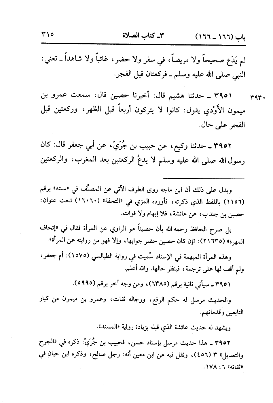3952- حَدَّثَنَا وَكِيعٌ ، عَنْ حَبِيبِ بْنِ جُرَيٍّ ، عَنْ أَبِي جَعْفَرٍ ، قَالَ : كَانَ رَسُولُ اللهِ صَلَّى الله عَلَيْهِ وَسَلَّمَ لا يَدَعُ الرَّكْعَتَيْنِ بَعْدَ الْمَغْرِبِ ، وَالرَّكْعَتَيْنِ قَبْلَ الْفَجْرِ فِي حَضَرٍ وَلا سَفَرٍ. (1/389).