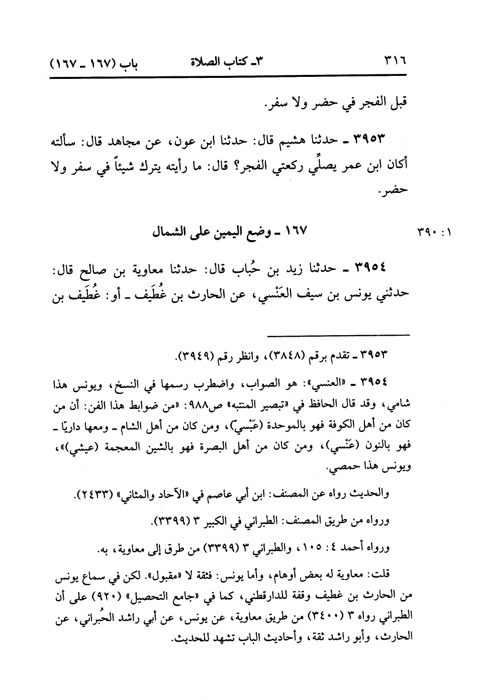 3954- حَدَّثَنَا زَيْدُ بْنُ حُبَابٍ , قَالَ : حدَّثَنَا مُعَاوِيَةُ بْنُ صَالِحٍ ، قَالَ : حَدَّثَنِي يُونُسُ بْنُ سَيْفٍ الَعَنَسِيُّ ، عَنِ الْحَارِثِ بْنِ غُطَيْفٍ - أَوْ غُضَيْفِ بْنِ الْحَارِثِ الْكِنْدِيِّ ، شَكٌّ مِن مُعَاوِيَة - قَالَ : مَهْمَا رَأَيْتُ نَسِيتُ لَمْ أَنْسَ أَنِّي رَأَيْت رَسُولَ اللهِ صَلَّى الله عَلَيْهِ وَسَلَّمَ وَضَعَ يَدَهُ الْيُمْنَى عَلَى الْيُسْرَى ، يَعْنِي : فِي الصَّلاَةِ. (1/390).
