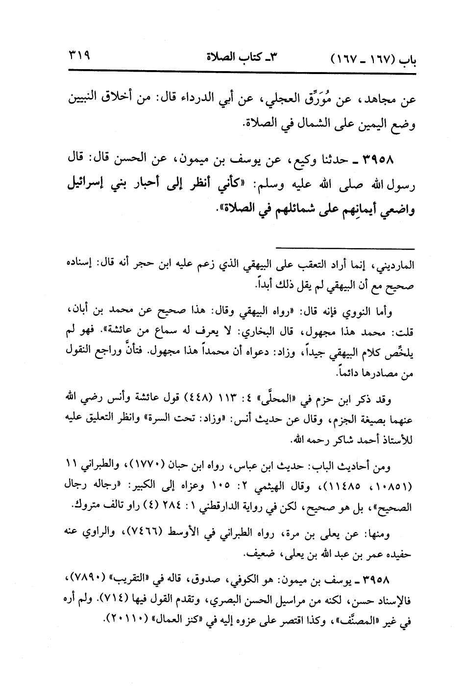 3958- حَدَّثَنَا وَكِيعٌ ، عَنْ يُوسُفَ بْنِ مَيْمُونٍ ، عَنِ الْحَسَنِ ، قَالَ : قَالَ رَسُولُ اللهِ صَلَّى الله عَلَيْهِ وَسَلَّمَ : كَأَنِّي أَنْظُرُ إلَى أَحْبَارِ بَنِي إسْرَائِيلَ وَاضِعِي أَيْمَانِهِمْ عَلَى شَمَائِلِهِمْ فِي الصَّلاَةِ. (1/390).
